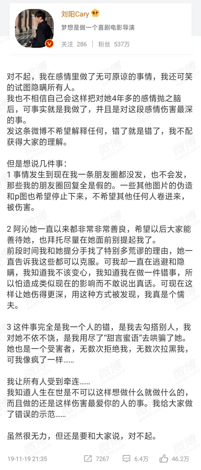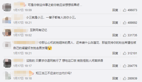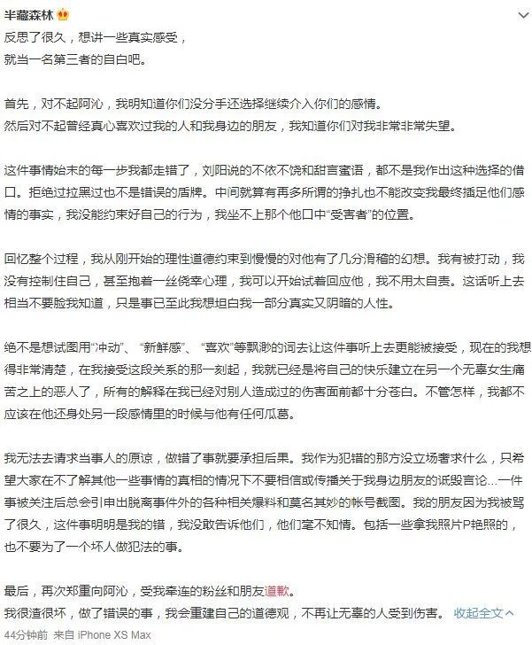 三观再次被震碎! 先简单说一下事情的经过吧。 日前,半藏森林先是在微博上po了一组cos春丽的美图,原本也没啥。 但4个小时后,又在小号上发了同样类型的图,并配文:“几张企鹅爸爸没选的图,自己觉得超酷,光叔直接给我3D建模了一条街”。 网友一看,顿觉不简单,便在评论区发问:“跟鹅厂合作了?”没想到这一问,还真给问出来了,半藏森林说是的。 难怪大号要特意发呢,原来是为了恰饭。 这事曝光之后,瞬间引发争议。 有网友认为,按照半藏森林的热度和流量,接个广告没啥。 但绝大多数网友觉得,按照她的口碑,能接到这样重量级的广告,实在是德不配位。 毕竟互联网是有记忆的,半藏森林当小三插足网红阿沁和刘阳的事情,大家可没忘记呢。 2019年11月,阿沁发文宣布自己和恋爱5年的男友刘阳分手,并公布了分手原因——男方出轨。 阿沁还顺手晒出了刘阳出轨的证据,刘阳和第三者的聊天记录, 设成屏保的第三者的照片。 随着阿沁手撕渣男之后,刘阳的更多黑料被曝出。 有阿沁身边朋友和粉丝称,刘阳出轨不止是这一次,而是从和阿沁在一起开始,就没停止过勾搭各种女生、撩骚粉丝、骚扰女员工。 事件主人公刘阳,在被各种锤都快锤爆了的时候,不仅没有跟阿沁道歉,反倒是第一时间联系了商务,希望把这件事的影响降到最低,因为自己还是要恰饭的。 这任谁看了不说一句,真渣。 最后,在全网的谴责下,刘阳无奈道歉,然后宣布退网,至今杳无音信。 而这件事的关键人物刘阳背着阿沁出轨的第三者究竟是谁,也被扒出来了,就是半藏森林。(她曾出现过刘阳的直播里) 网友不仅扒出她插足阿沁和刘阳,还扒出了更多黑料,比如惯三、整容等。 眼瞅着,这把火要将自己烧死了,半藏森林才不情不愿地出来道歉了。 之所以说是不情不愿,是因为从半藏森林的言语之间,都感觉她是无辜的,开头就说“就当一名第三者的自白吧”。 这感觉像是自己明明是清白的,却被被人莫名其妙扣上第三者的帽子似的。 在后面的自白中,更是言语间都是刘阳死缠烂打她才无奈当了第三者的,原文如下,大家自行感受吧。 道完歉,半藏森林也跟刘阳一样退网了。 但令人不可思议的事情发生了,半藏森林却因为这件事火了! 她的拍照风格、穿衣妆容、和男生的聊天方式等,都成为了网友研究的对象,虽然被调侃是茶艺大师,但魔幻的是她的拍照风格却在各类平台走红。 有一段时间微博、小红书等平台上,都是网友模仿半藏森林茶艺照的照片。 半藏森林怕是第一个因为当小三而走红的网红吧,毕竟在小三事件之前,没几个人知道半藏森林是何许人也。 茶艺风刮起之后,半藏森林也坐不住了,没多久便又复出了。 2020年2月,悄悄将自己之前隐藏的微博全都转为公开可见,还将头像换成了最新的写真照,算是第一次试水。 5个月后,半藏森林在其微博账号发布最近写真照,还特意回复了骂她的网友,称自己该承担的代价从来没有逃避过,每天都在认真生活,轮不到互联网来告诉她几更死。 这番表态,也算是正式告诉这些把她钉在小三耻辱柱上的网友,半藏森林回来了! 之后,半藏森林就开始了认真营业,经常在微博发布自己的美照,其中有条微博还引来了王思聪的评论。 这件事也让她再一次冲上热搜榜单。 现在,又接到了鹅厂代言,半藏森林应该是小三红利第一人吧。 也怪不得阿沁都在看到其代言广告后,在微博感慨:这个世界真的挺有意思的。 不过,在网友的抵制下,半藏森林又改口风了,说自己没接广告,只是拍的cos。 这……这是拿网友当猴耍? 一天之后,半藏森林再度发文,讲述了自己从小三事件之后,一直被网暴的经历。 口口声声说自己无意卖惨,可字里行间全都是在卖惨,真不愧是老茶艺大师了。 这波辩解也再度让网友愤怒:你说再多,你也是个三。 所以说做错事就该端正态度,该认错认错,该立正反思就得反思,诡辩这一套,是不会有人吃的。 说到这里,不得不提的是,半藏森林现在还能在这里蹦跶,还被这么多人看到,一定程度上也是因为网友说一套做一套。 嘴上喊着当小三就该得到世界上所有人的唾弃,却悄悄照着半藏森林的照片学起了穿搭和如何拍茶艺照。 阿美想说: 如果大家真的痛恨小三,还请做到言行一致吧。