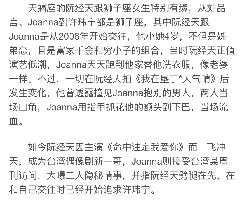 Joanna不是第一次爆料了,她曾经自爆过是阮经天的前女友,当时阮经天刚刚和刘品言分手。据她所说,她与阮经天分手是因为男方劈腿许玮宁,当然男方对出轨一事予以否认。