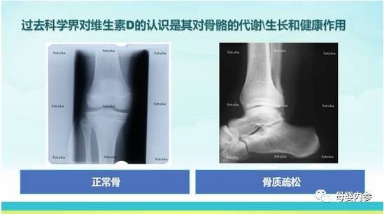 维生素D直接或间接地参与骨内进行的所有过程:骨细胞的增生、分化,骨基质的形成、成熟和钙化,骨质的重吸收等;维生素D对骨钙、磷的沉积与释放,对体液酸碱度的调节,对骨的结构和物理性都有直接的影响。维生素D缺乏对婴儿将引起佝偻病;对成人,尤其是孕妇、乳母和老人,可使已成熟的骨骼脱钙而发生骨质软化和骨质疏松。