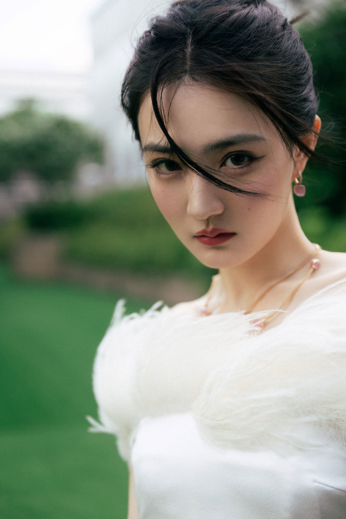 近日,徐璐身穿羽毛抹胸白色礼服尽显优雅,绿色草坪上拍摄写真照,扎丸子头对镜头上演“眼神杀”。
