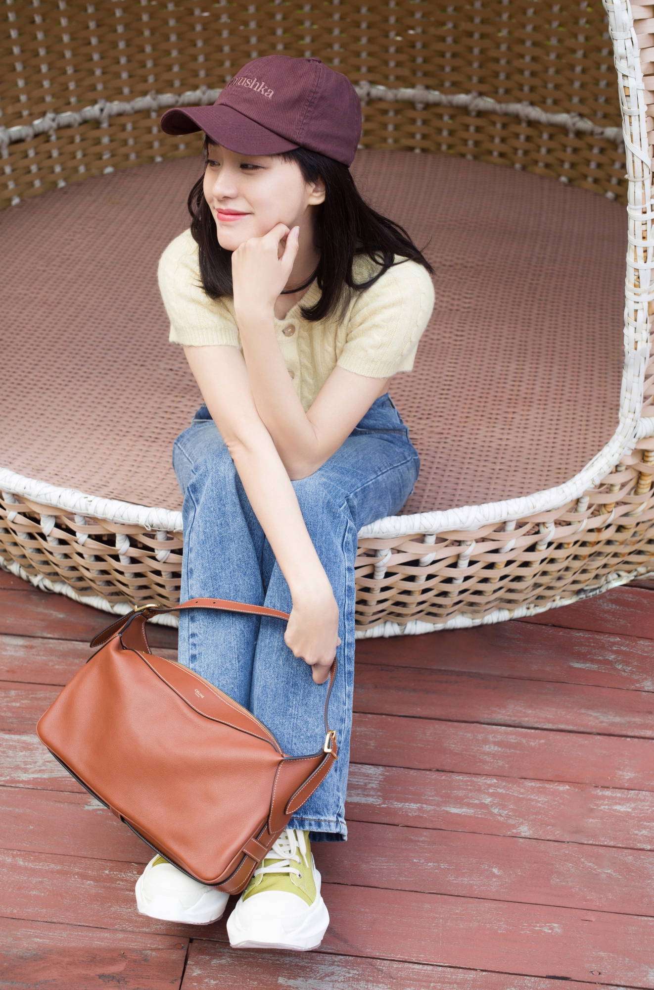 演员王智微博分享今日份OOTD并祝大家小年快乐,米黄色针织衫搭配修身微喇牛仔裤,露出小蛮腰彰显好身材。小姐姐头戴棒球帽斜挎棕色包包,脚上一双绿高帮帆布鞋,整体造型简约舒适,清爽时髦很有春天的感觉。