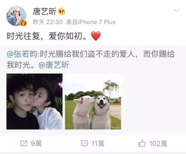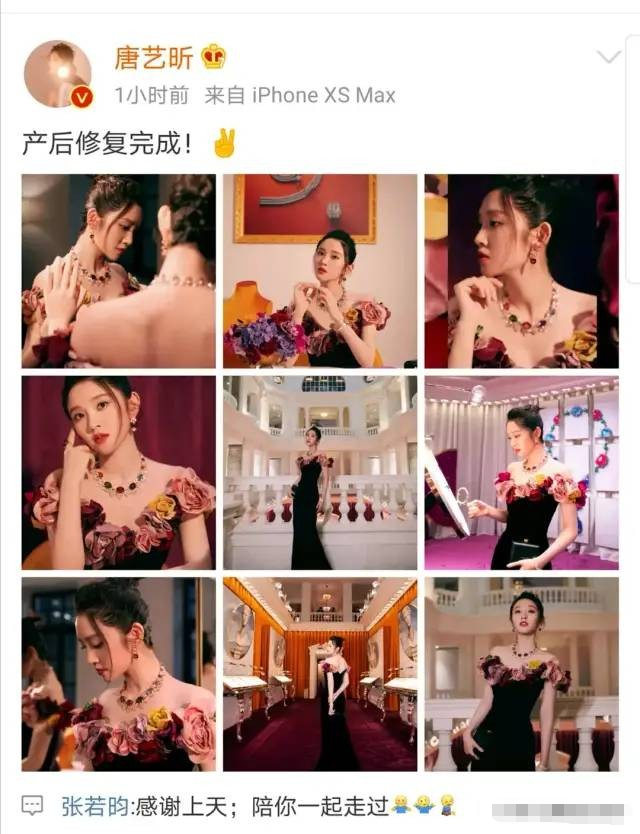 当时唐艺昕也发了一条微博,庆祝产后修复完成,而张若昀的回复是:感谢上天,陪你一起走过。