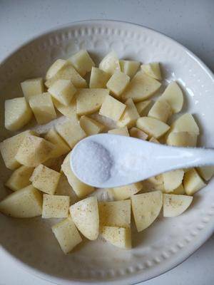 6. 土豆调味:土豆平铺一层,撒上白胡椒粉和细盐。