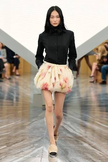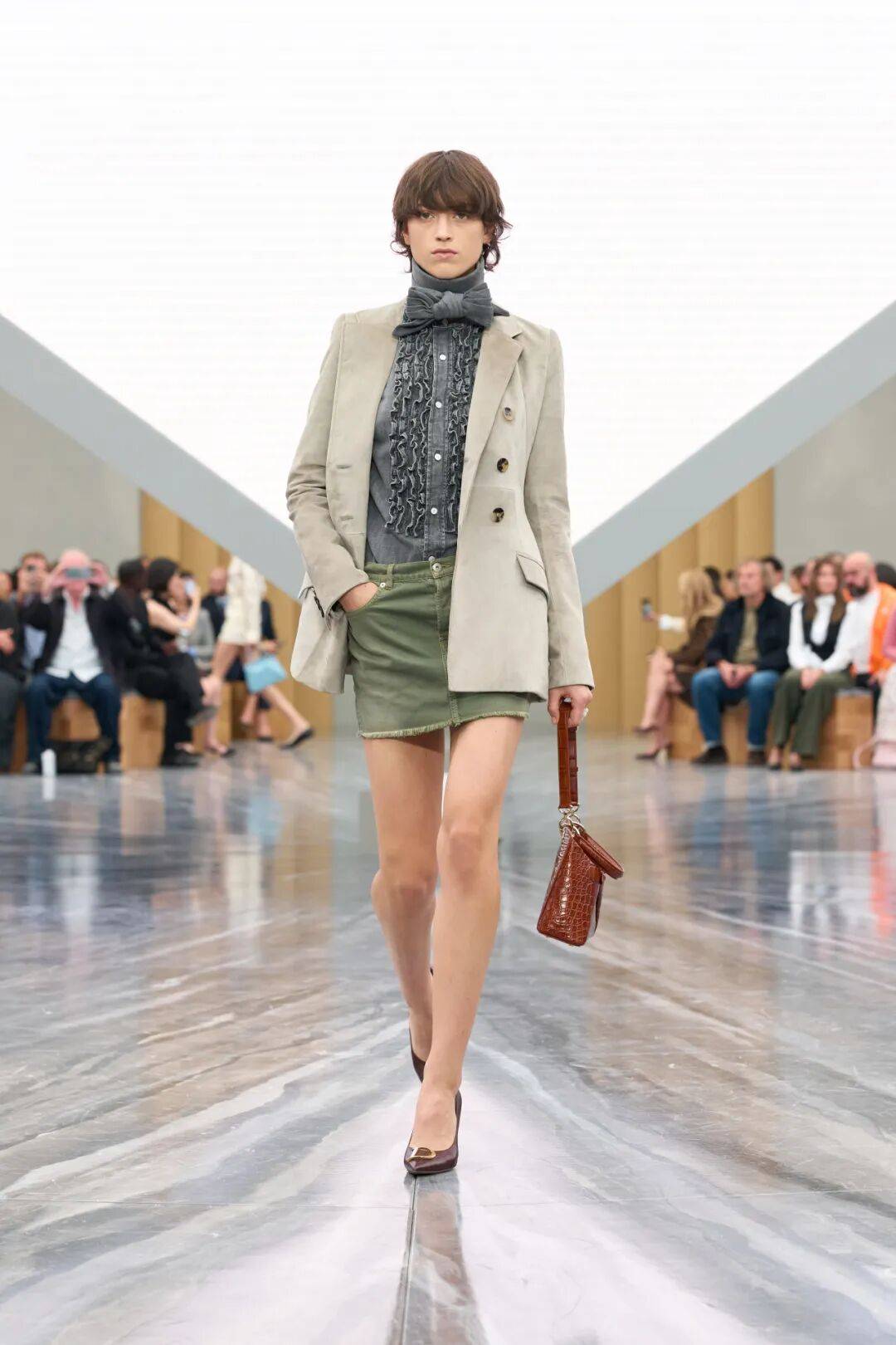 灵感源自创始人 Christian Dior 对花园的热爱,Anderson 将褶皱化为花瓣、丝绸垂坠喻作风中枝条,让自然成为“生命循环的哲思”而非装饰元素 。Bar Jacket 获得“新心跳”,线条如呼吸般灵动;裙撑与斗篷带着“有重量的轻盈”,让优雅从“被框定”转为“由内而外的气场”。他刻意削弱礼服厚重感,刺绣燕尾服搭配丹宁迷你裙,打破高定框架,诠释“不拘一格的现代优雅”。