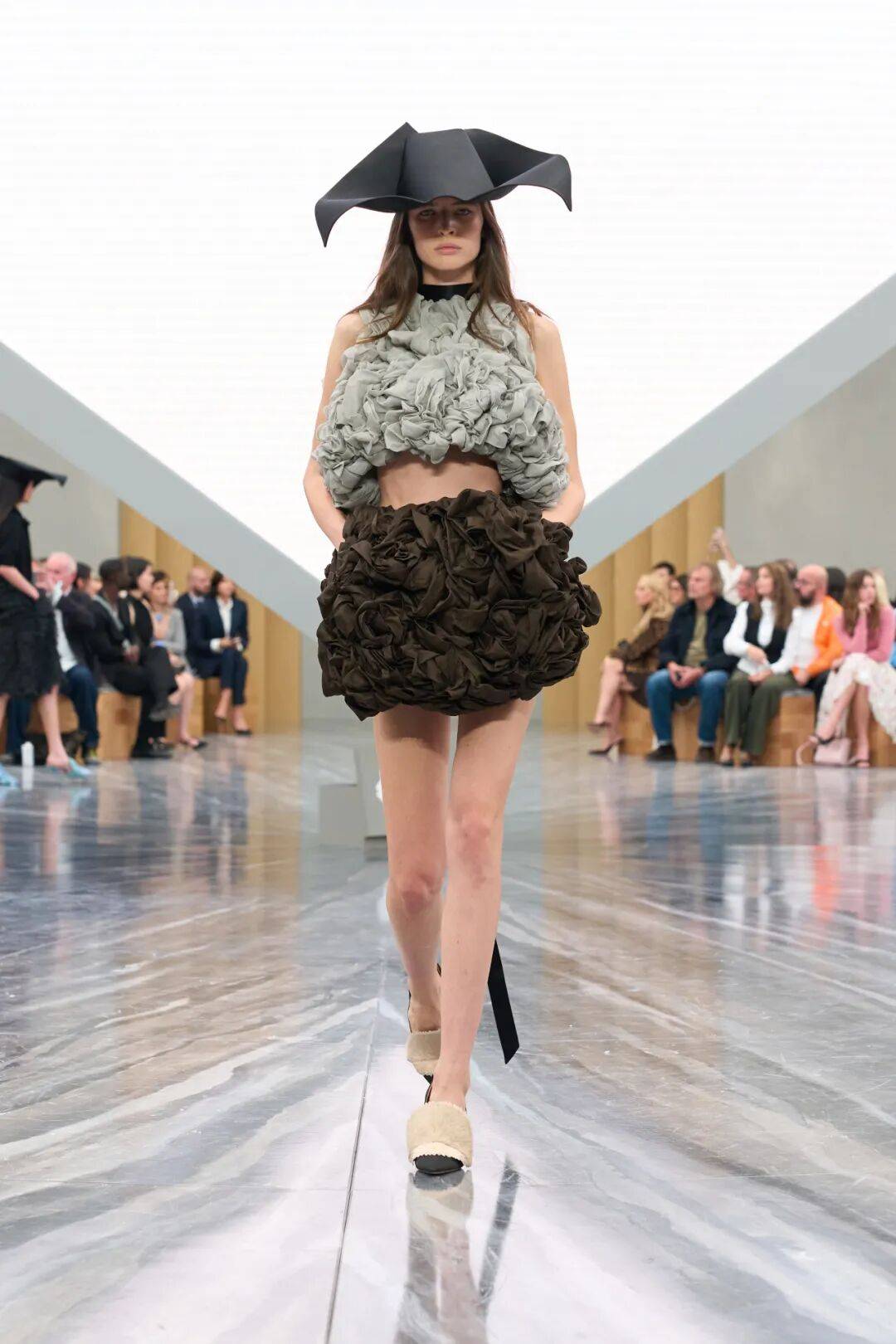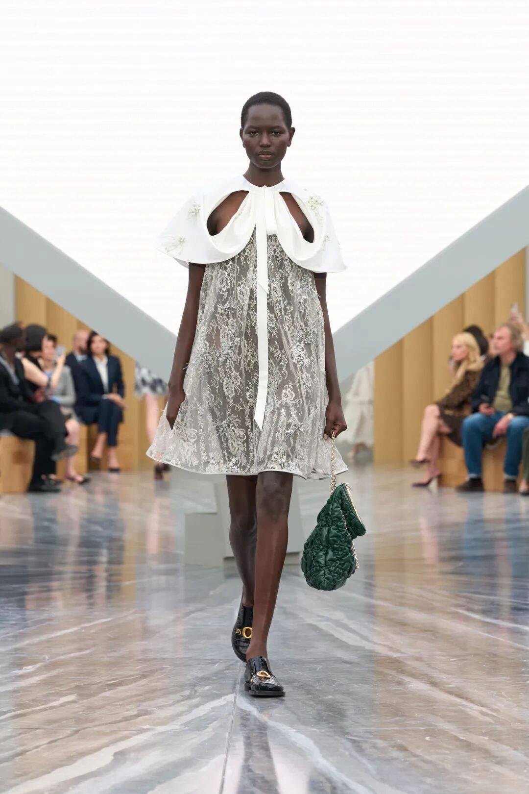 Anderson 以“结的变奏”作为贯穿全场的系统化符号语言——从 micro 颈结到 macro 腰结,通过位置、材质、尺度的变换,让装饰成为结构,甜美中藏匿力量 。开场的白色蝴蝶结裙摆定调浪漫古典主义,而颈上硕大蝴蝶结则制造“散漫中的严肃仪式感”。这种“反差美学”形成设计交响曲:针织披风的舒适感 × 夸张蝴蝶结的吸睛力,风平浪静 × 风高浪急的情绪漂流 。