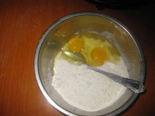 第二步:把西葫芦丝和胡萝卜丝放在一个大碗里,打入两个鸡蛋,加点盐(如果之前西葫芦已经用盐腌过,这里就少放点),再滴几滴香油。然后慢慢加入面粉,一边加一边用筷子搅拌。