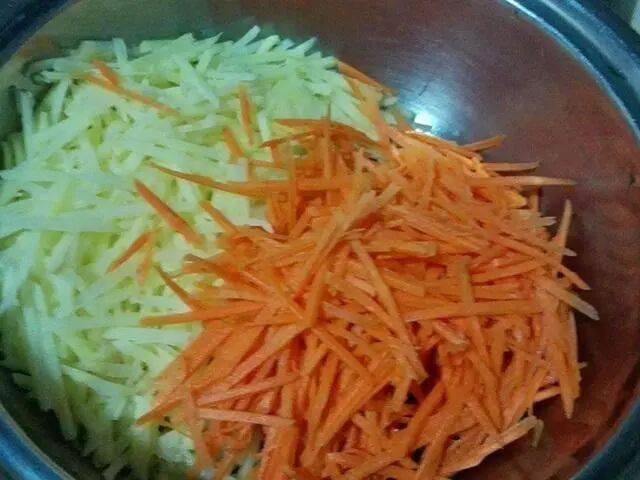 1、把土豆和胡萝卜清洗干净,擦成丝