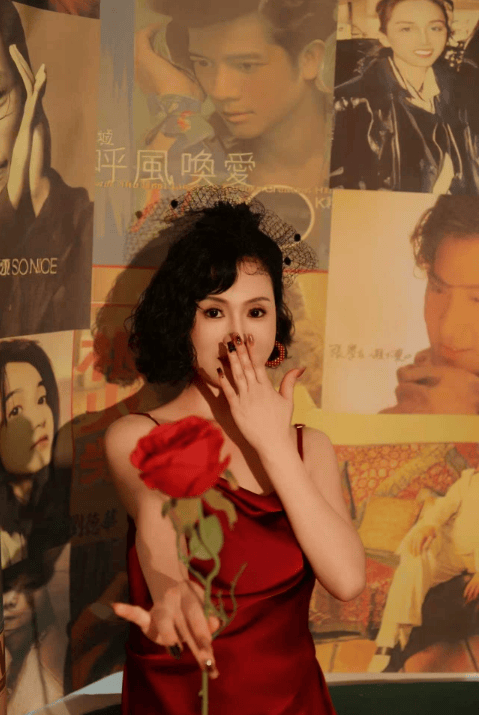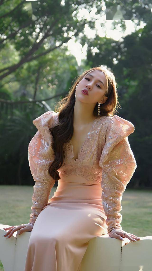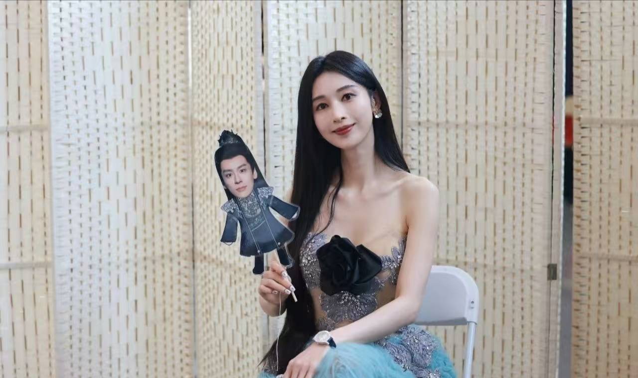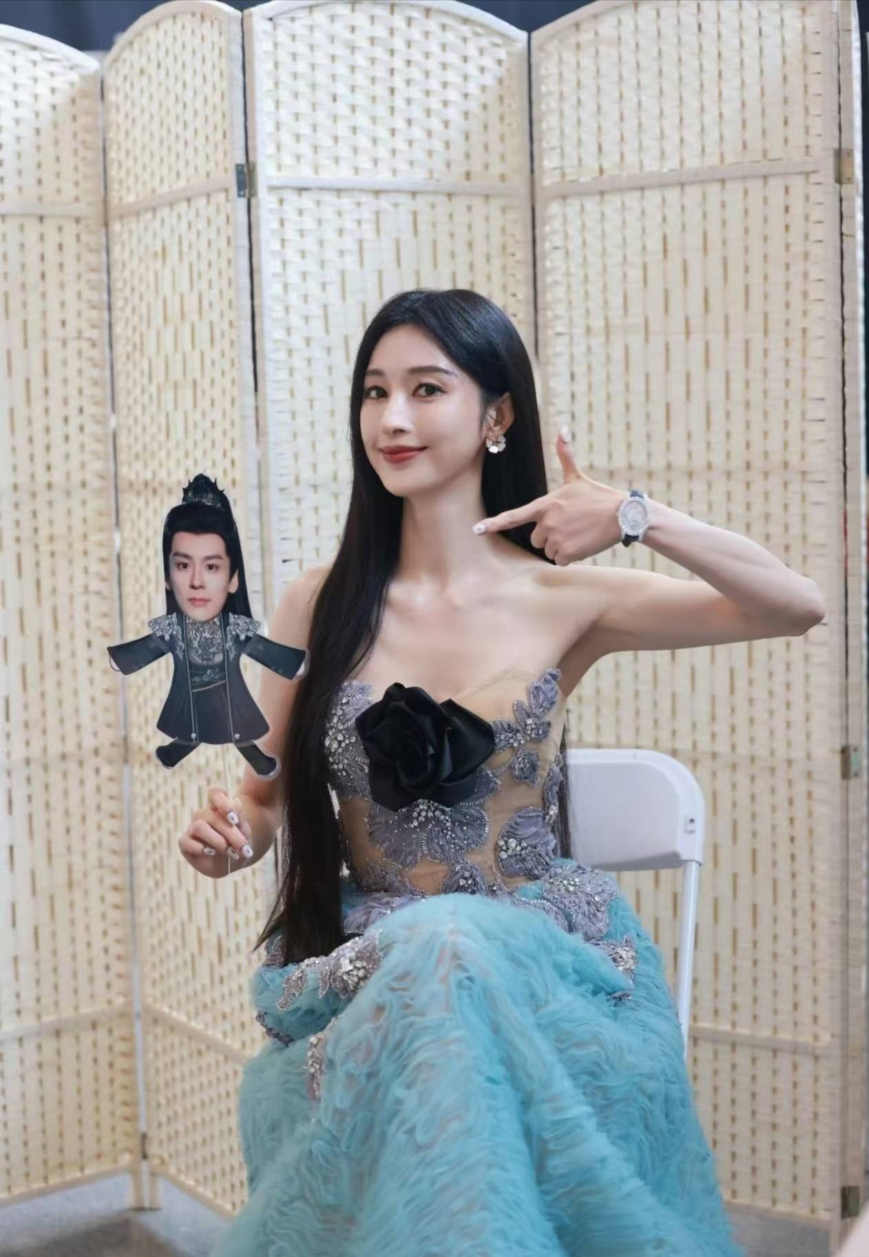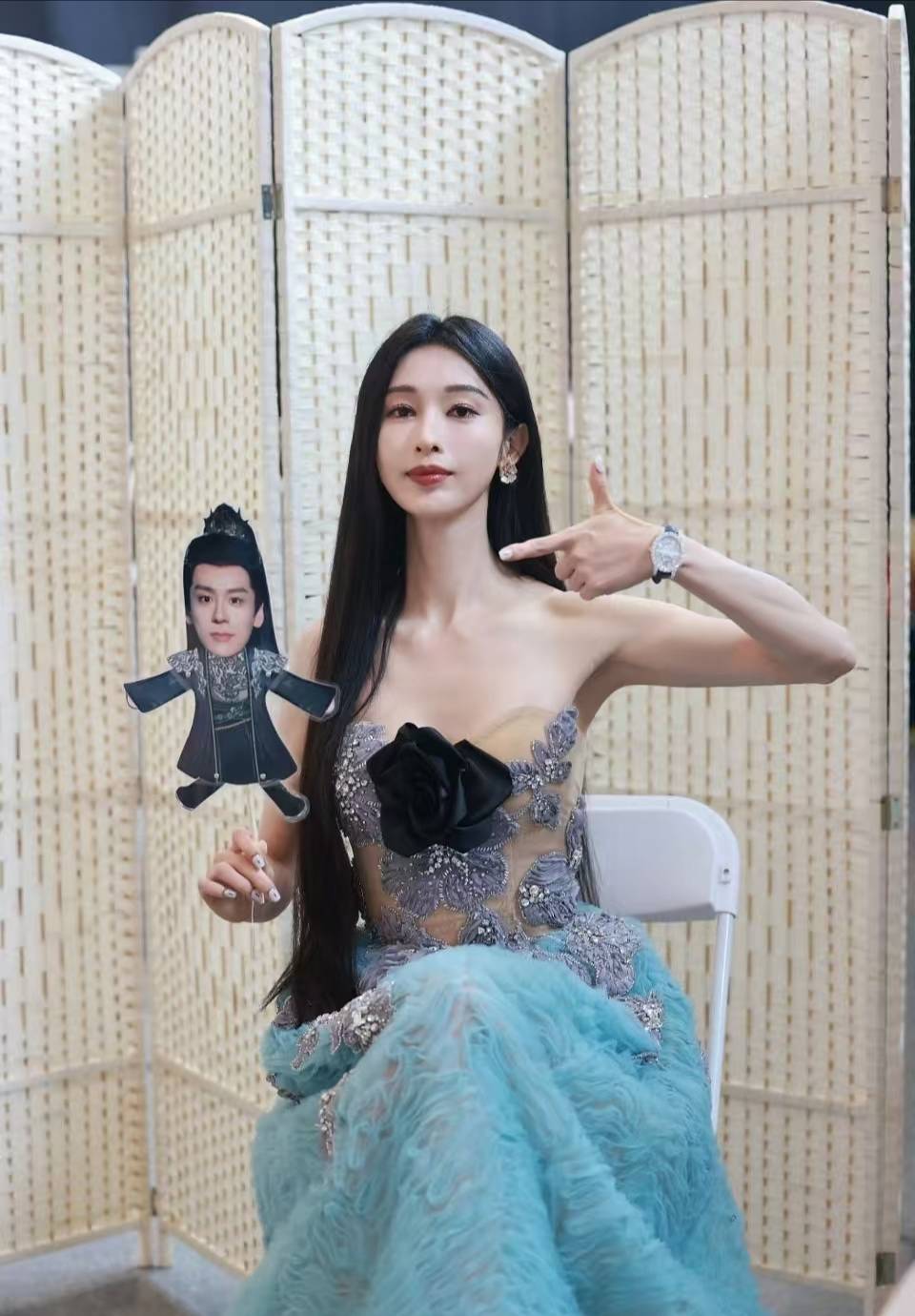 她坐在白色的椅子上,背景是浅色的竹编屏风,这搭配简直绝了,把她的礼服衬托得更加亮眼。她手里拿着一个魏哲鸣的卡通人形立牌,还比着可爱的姿势,一会儿指向立牌,一会儿又自己比个俏皮的姿势,脸上带着甜甜的笑容,感觉她心情超好的。这和她以往在影视剧里的形象不太一样呢,像在《风起洛阳》里她饰演的窈娘,那种隐忍又深情的模样让人印象深刻,而这组照片里的她,更多了一份灵动和俏皮。