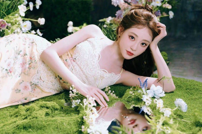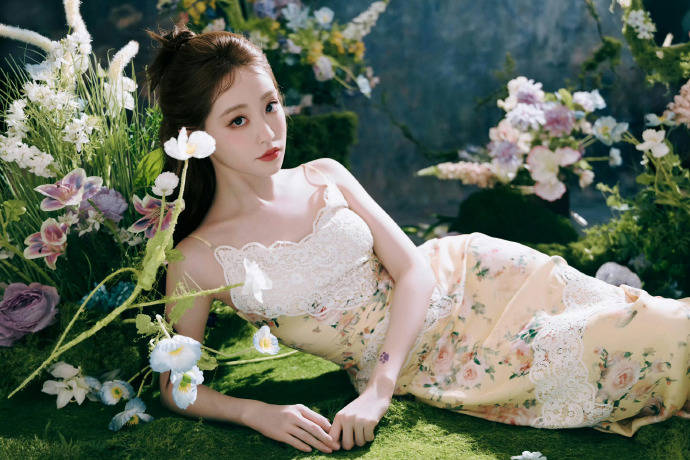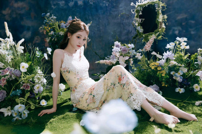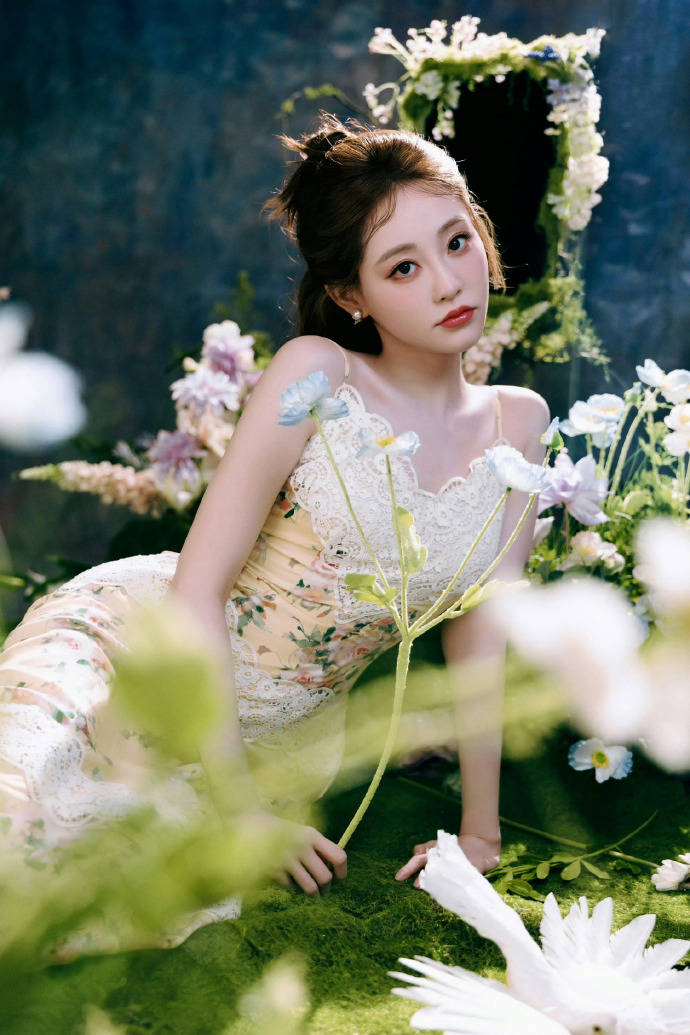 先说说这造型和场景的搭配,简直绝了。淡黄色的裙子上,粉色、白色的花朵图案清新又温柔,蕾丝的点缀更是增添了几分精致感。周围的鲜花色彩丰富,有白色、紫色、粉色的,还有翠绿的枝叶和苔藓,把她衬得既温柔又灵动,仿佛她本来就是这片花海的一部分,随便往那儿一坐、一躺,都像在拍电影画面。