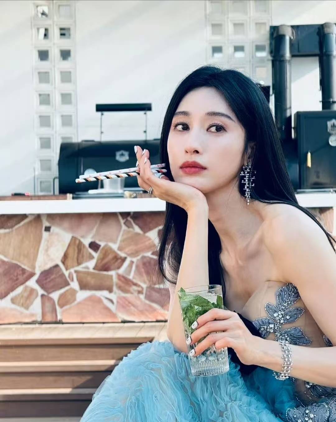 还有那张她坐在户外的照片,手里拿着一杯加了薄荷叶的饮料,吸管上红白相间的条纹和饮料里的绿色薄荷叶形成鲜明对比。她手肘撑在膝盖上,手托着脸,眼神看向一侧,若有所思的样子。阳光洒在她身上,给她的礼服镀上了一层柔和的光晕,让她看起来就像从画里走出来的仙子一样。