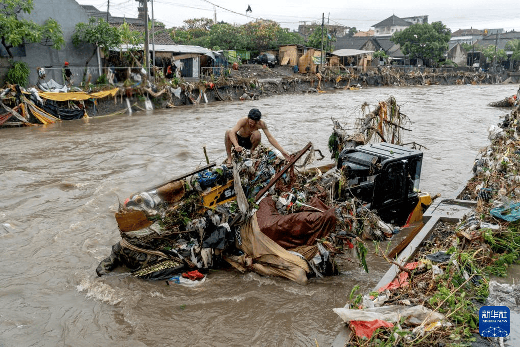 当地时间2025年9月10日,印度尼西亚巴厘岛登巴萨,一名男子蹲在被洪水冲毁的挖掘机上。连日来,印度尼西亚巴厘岛和东努沙登加拉省持续暴雨引发洪水,已造成至少19人死亡、10人失踪。新华社发(迪基 摄)