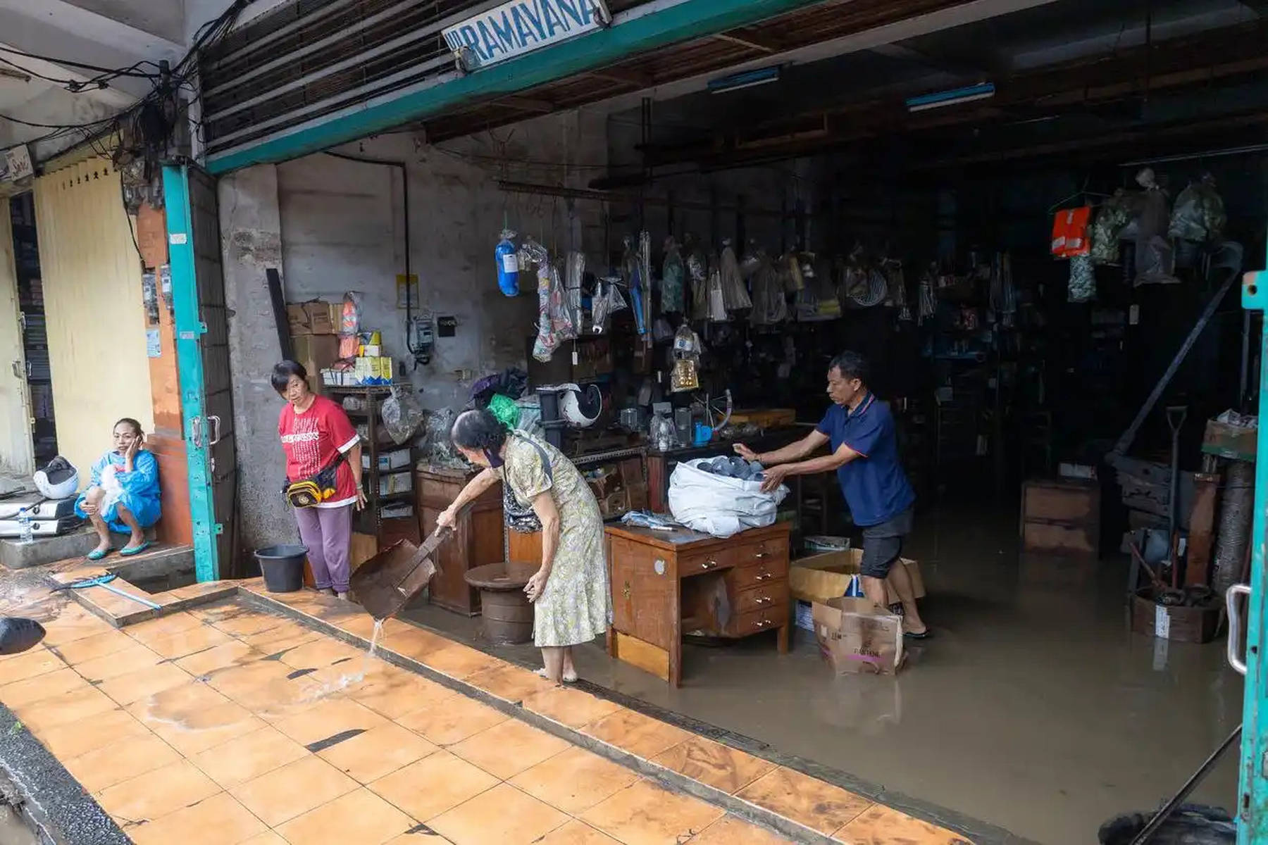 当地时间2025年9月10日,印度尼西亚巴厘岛的登巴萨,人们清理店铺的积水。受暴雨持续影响,印度尼西亚的旅游胜地巴厘岛等地发生洪灾。新华社/欧新