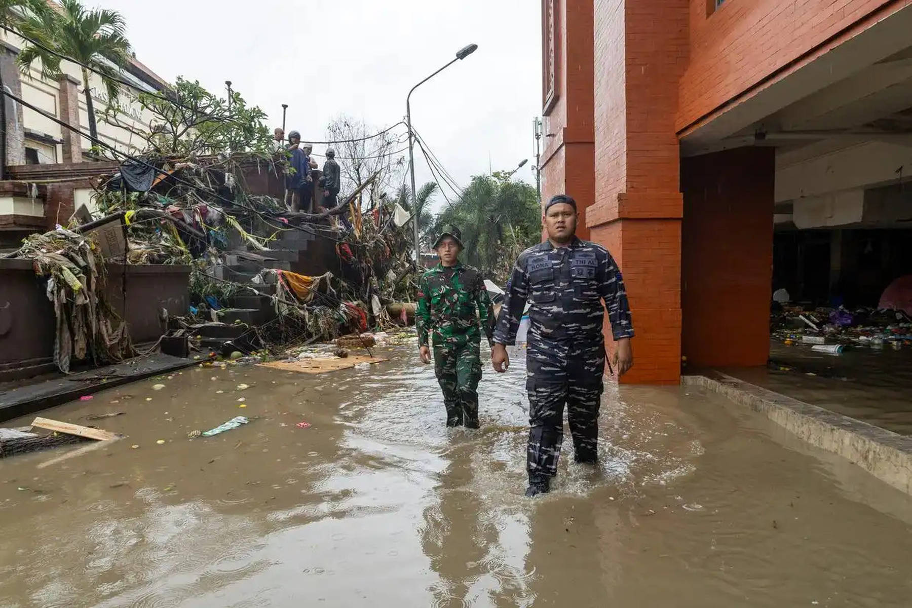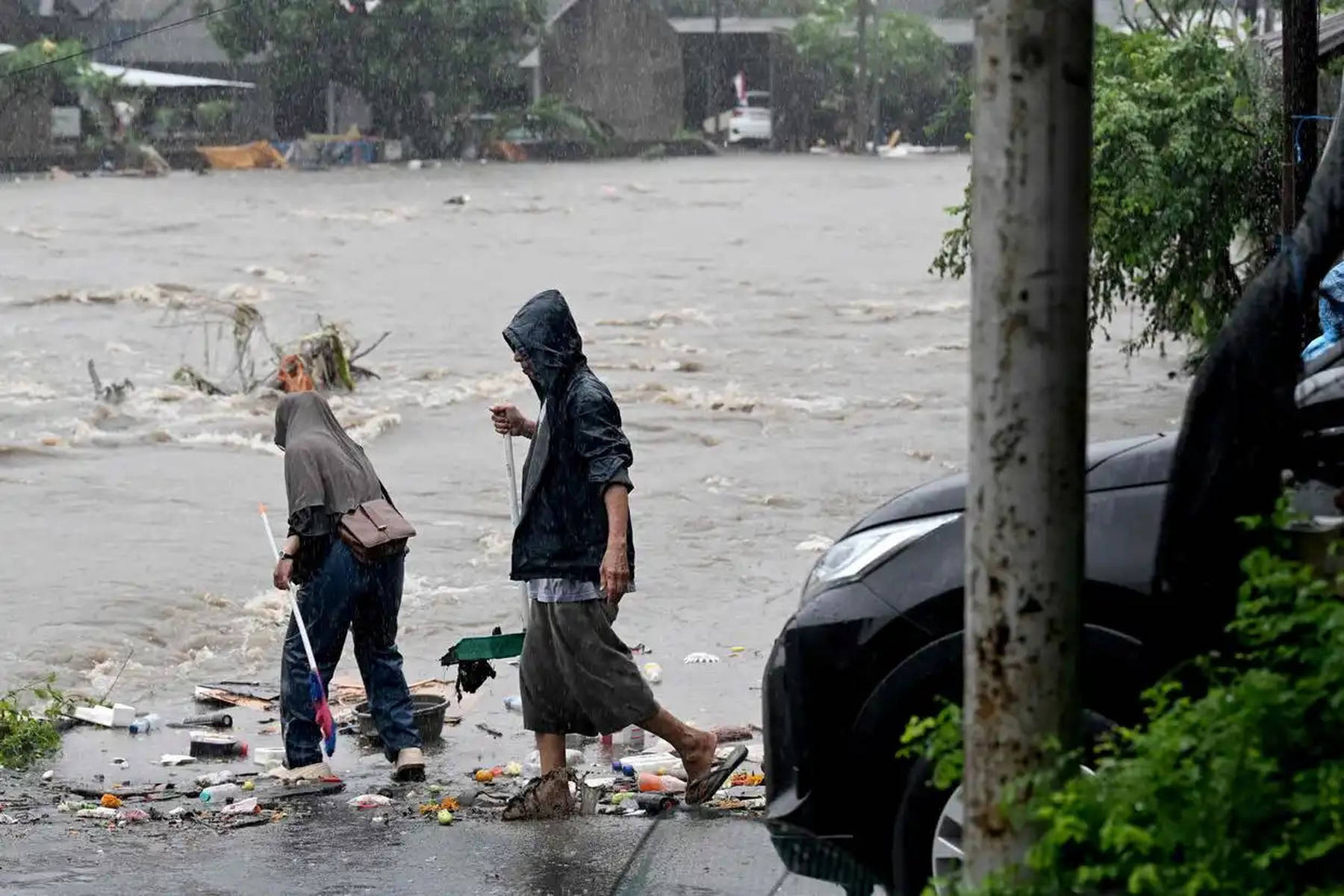 当地时间2025年9月10日,印度尼西亚巴厘岛的登巴萨,人们涉水活动。受暴雨持续影响,印度尼西亚的旅游胜地巴厘岛等地发生洪灾。新华社/法新
