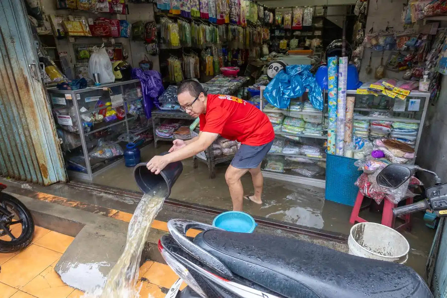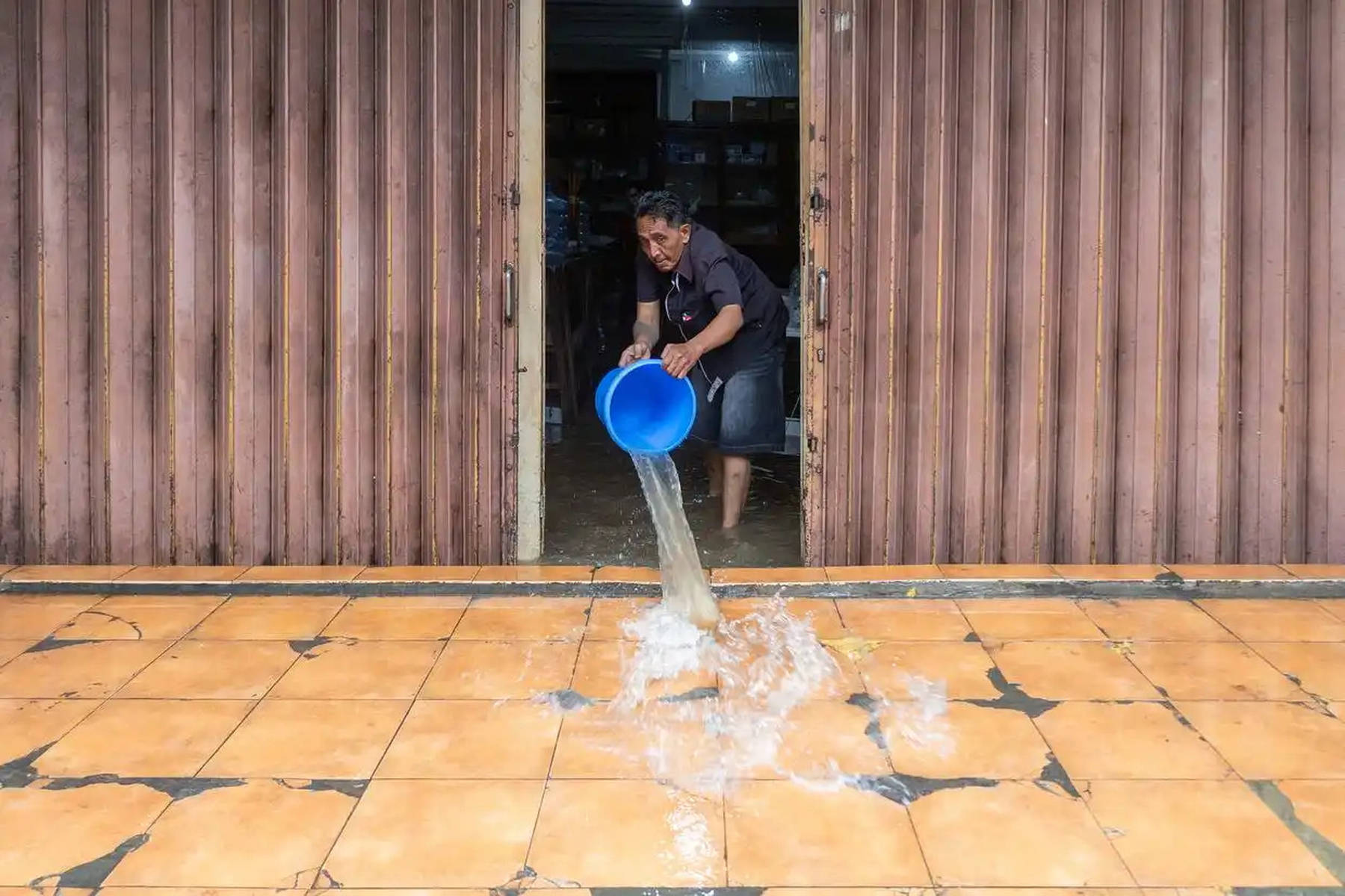 当地时间2025年9月10日,印度尼西亚巴厘岛的登巴萨,洪水过後一名男子清理店铺。受暴雨持续影响,印度尼西亚的旅游胜地巴厘岛等地发生洪灾。新华社/欧新