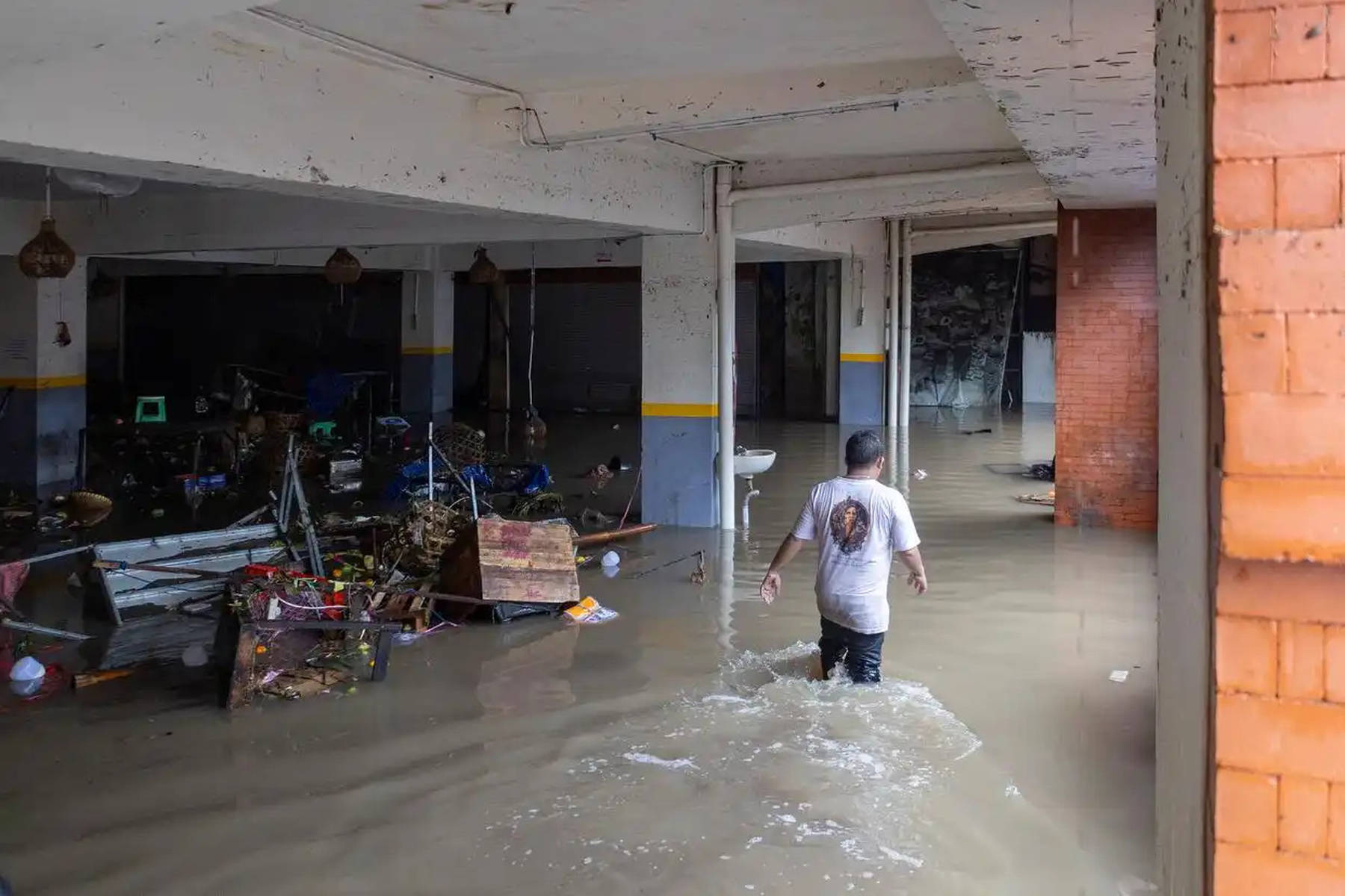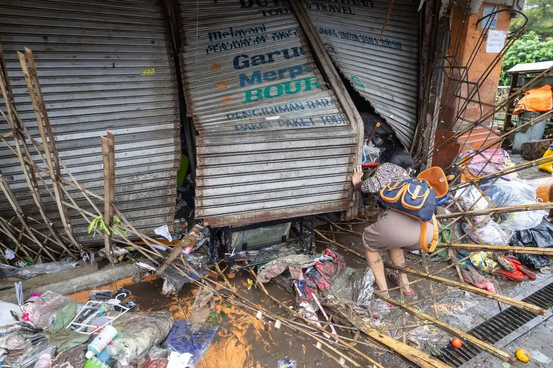 当地时间2025年9月11日,印度尼西亚巴厘岛登巴萨,一名男子检查店铺受损情况。连日来,印度尼西亚巴厘岛和东努沙登加拉省持续暴雨引发洪水,已造成至少19人死亡、10人失踪。新华社发(迪基·比辛拉西 摄)
