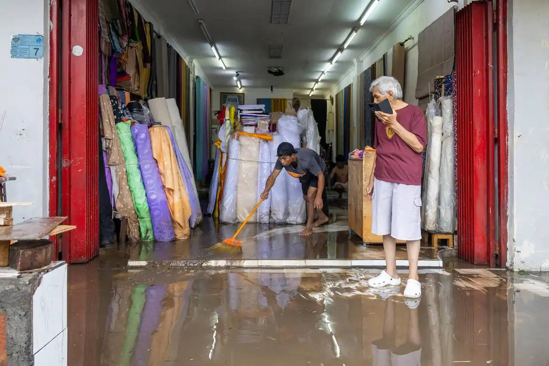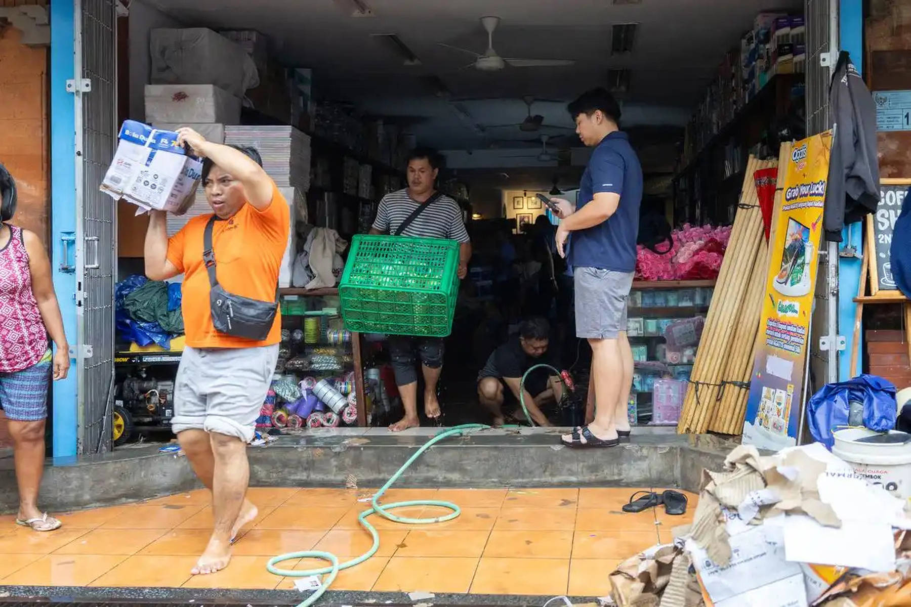 当地时间2025年9月10日,印度尼西亚巴厘岛的登巴萨,人们在清理店铺。受暴雨持续影响,印度尼西亚的旅游胜地巴厘岛等地发生洪灾。新华社/欧新