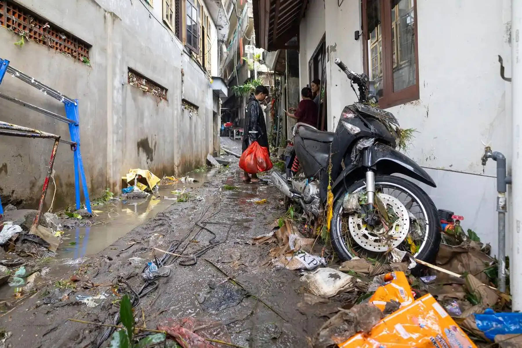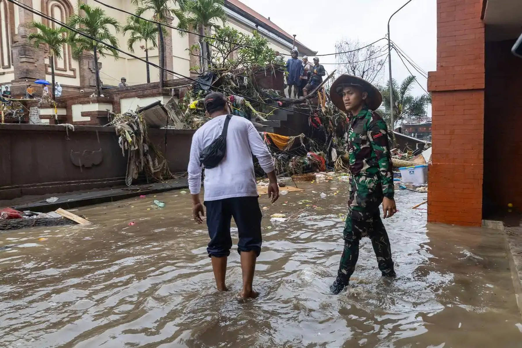 当地时间2025年9月10日,印度尼西亚巴厘岛的登巴萨,人们在洪水过後的街道旁交谈。受暴雨持续影响,印度尼西亚的旅游胜地巴厘岛等地发生洪灾。新华社/欧新