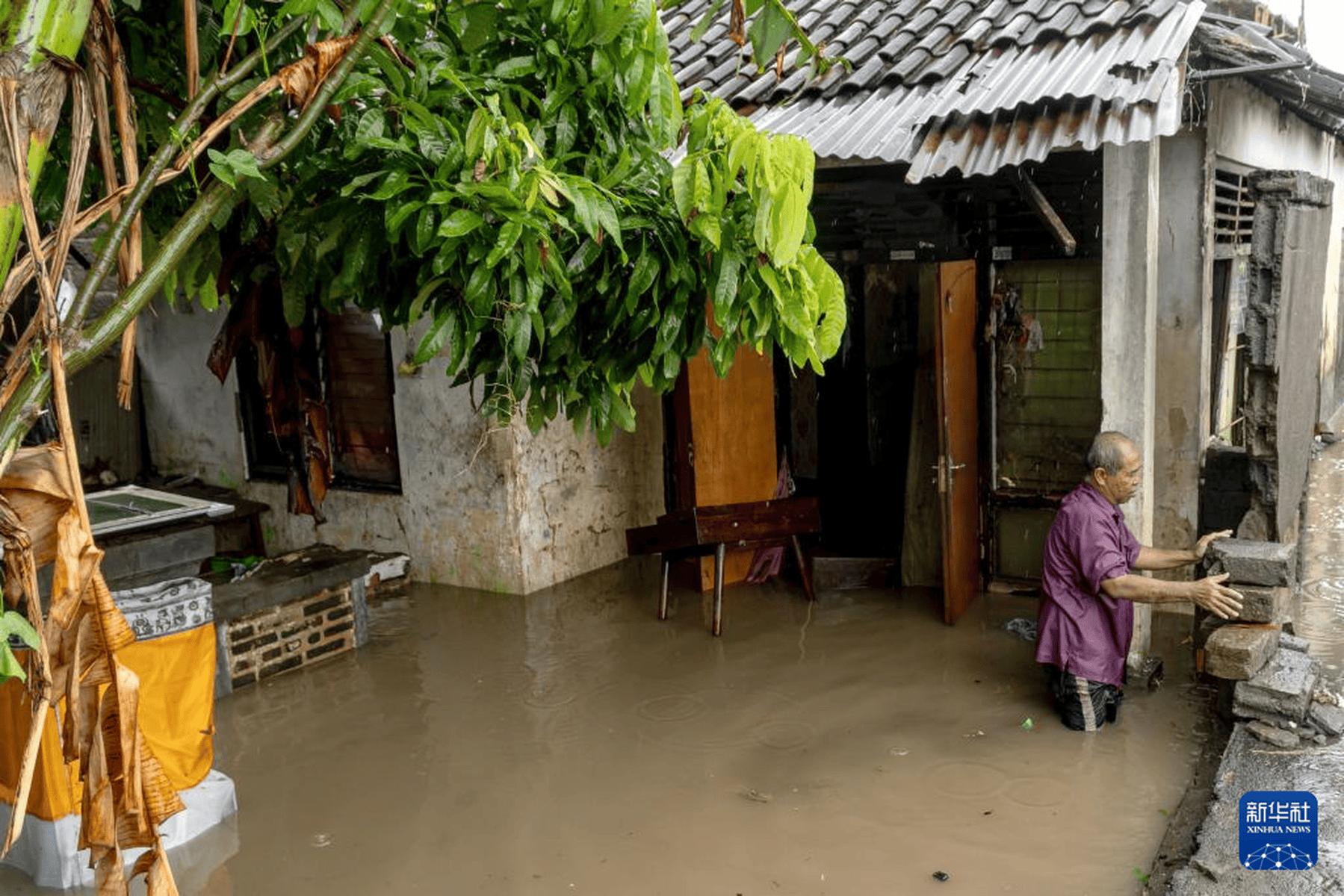当地时间2025年9月10日,印度尼西亚巴厘岛登巴萨,一名男子站在遭到洪水侵袭的房屋外。连日来,印度尼西亚巴厘岛和东努沙登加拉省持续暴雨引发洪水,已造成至少19人死亡、10人失踪。新华社发(迪基 摄)