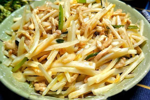 7、锅中再放少许油,凉油放入葱姜丝煸香,倒入藕丝翻炒,快速烹入半勺白醋翻炒。