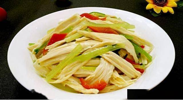 4、下入豆腐干,炒干水分,下入芹菜,盐,鸡精炒制入味即可