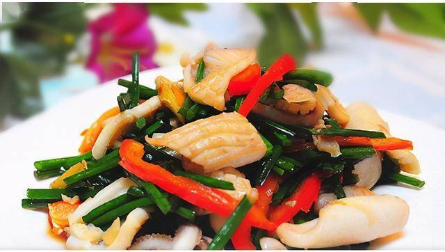 材料:海螺肉300克、韭菜300克、料酒、姜片、枸杞、盐、味精