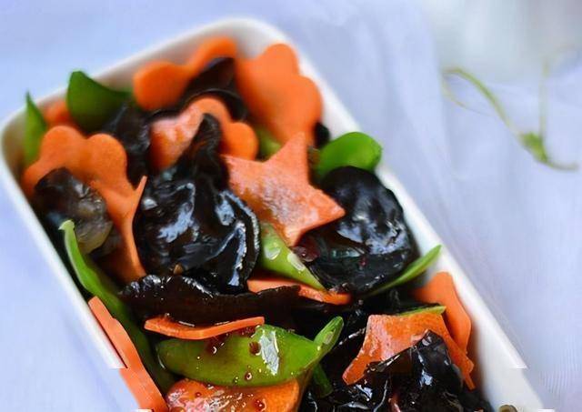 材料:黑木耳30克、胡萝卜半个、荷兰豆20克、辣椒酱1勺、生抽1勺、香醋半勺、鸡粉小半勺、白糖少许