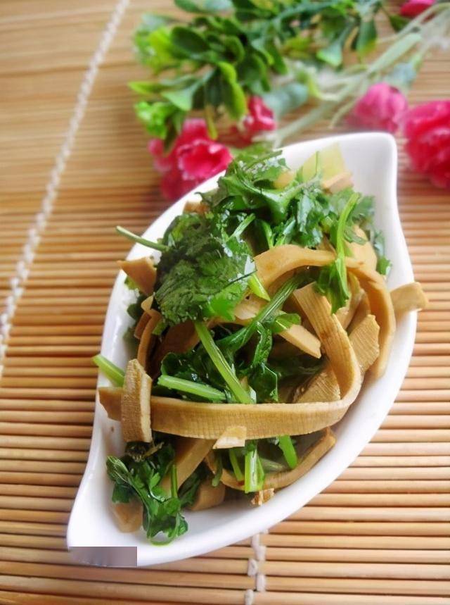 材料: 豆腐皮、香菜、盐、生抽、葱、姜、蒜、花椒粉