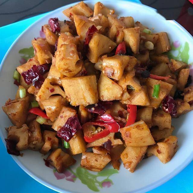 炒锅内放适量的油,放入姜丝、青椒丝、红辣椒煸炒,煸炒出香味以后倒入藕丁翻炒,约一分钟以后倒入配好的酱汁,再加入少量的盐调味,一直翻炒到酱汁均匀地包裹在藕丁上,即可起锅,最后再撒上一把葱花。