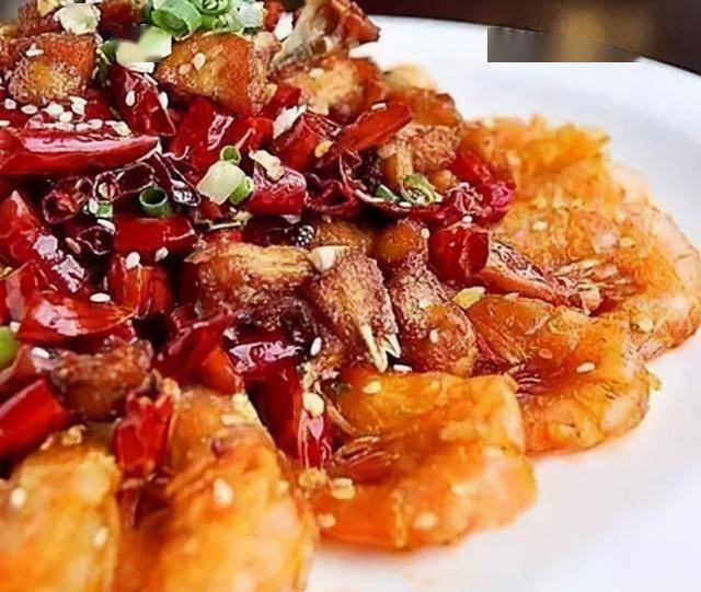 3、往炒锅里放香辣油烧热,先下干辣椒节、干花椒、姜末和蒜末炒香,再放入炸好的大虾、鸡丁,加盐和味精,待翻炒至香辣味浓时,撒入葱花和熟芝麻,翻匀便可起锅装盘。