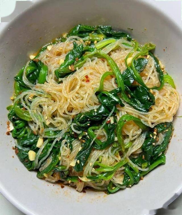 食材:菠菜200g、粉丝100g、蒜末10g、生抽10ml、香醋10ml、香油5ml、盐适量。
