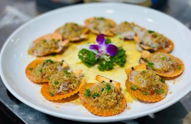 扇贝摆粉丝上,铺蒜蓉酱,大火蒸 8-10 分钟;