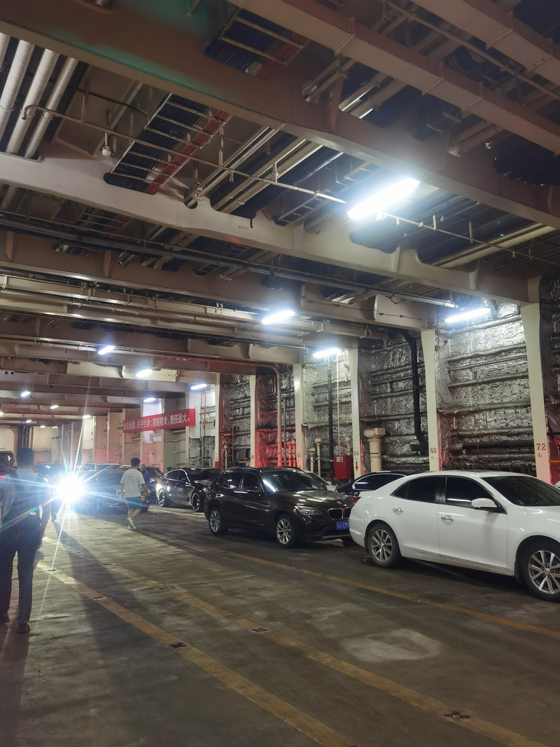 准备下楼开车。不开车的乘客从另外一个出口下船,有车的旅客在这里排队,走楼梯下到车库。车库又高又宽,感觉比我们在天津泰达航母公园看到的基辅号航母还要大。