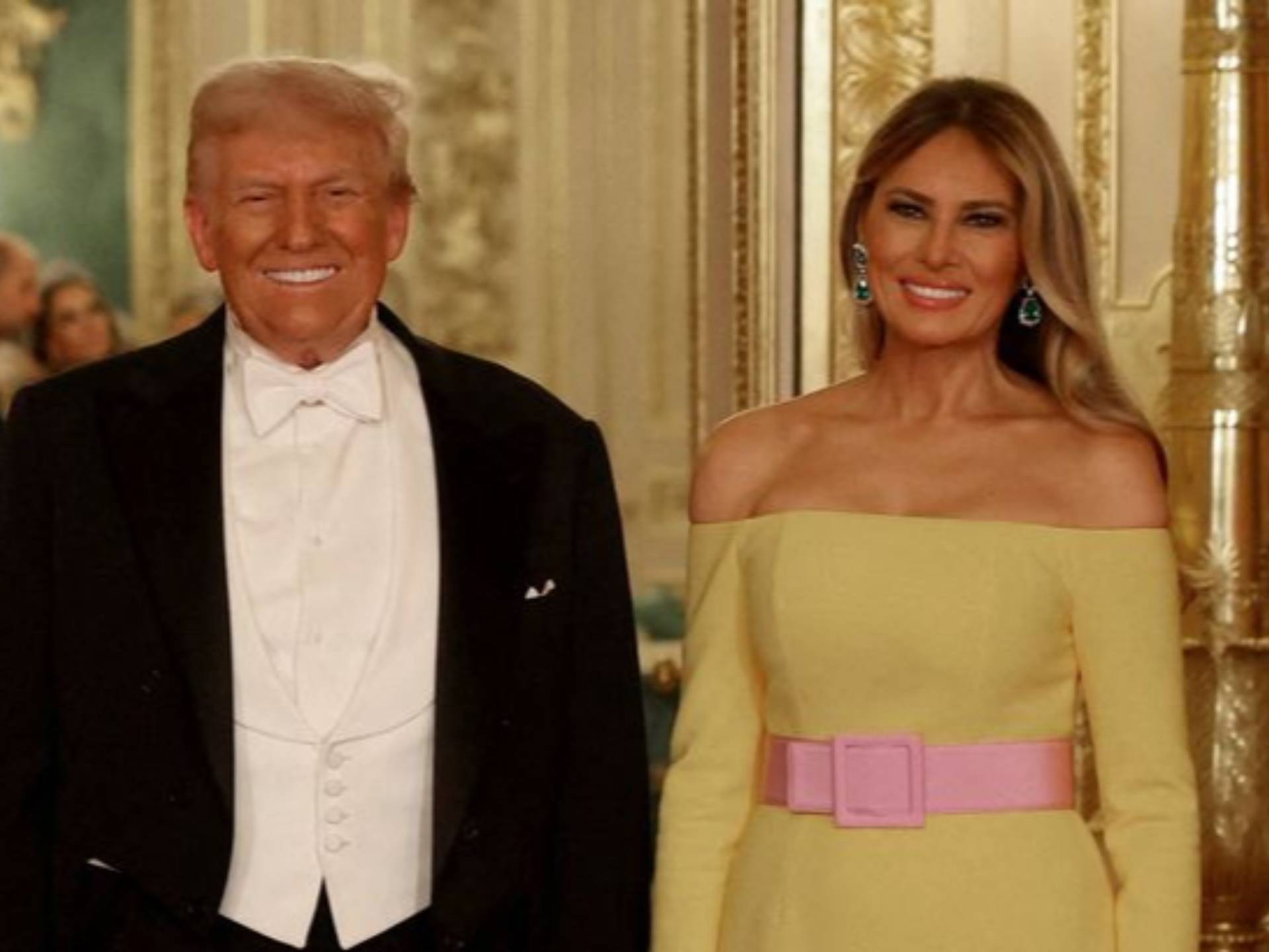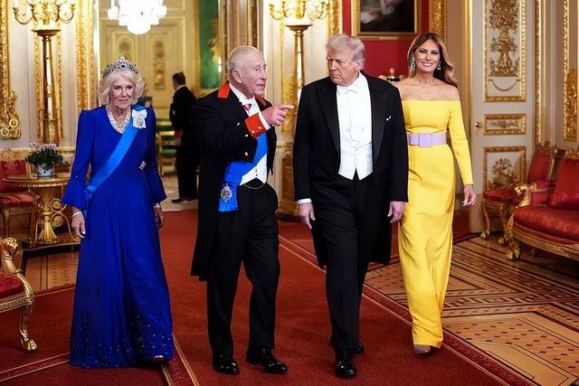 在国王查尔斯三世与卡米拉王后,共同主持的这场国宴上,梅拉尼娅·特朗普以一件大胆的露肩黄色礼服成为全场焦点。这位55岁的第一夫人以厚实的婴儿粉色腰带与祖母绿和钻石耳环作为点缀,为这一声明式造型画上了完美句号。