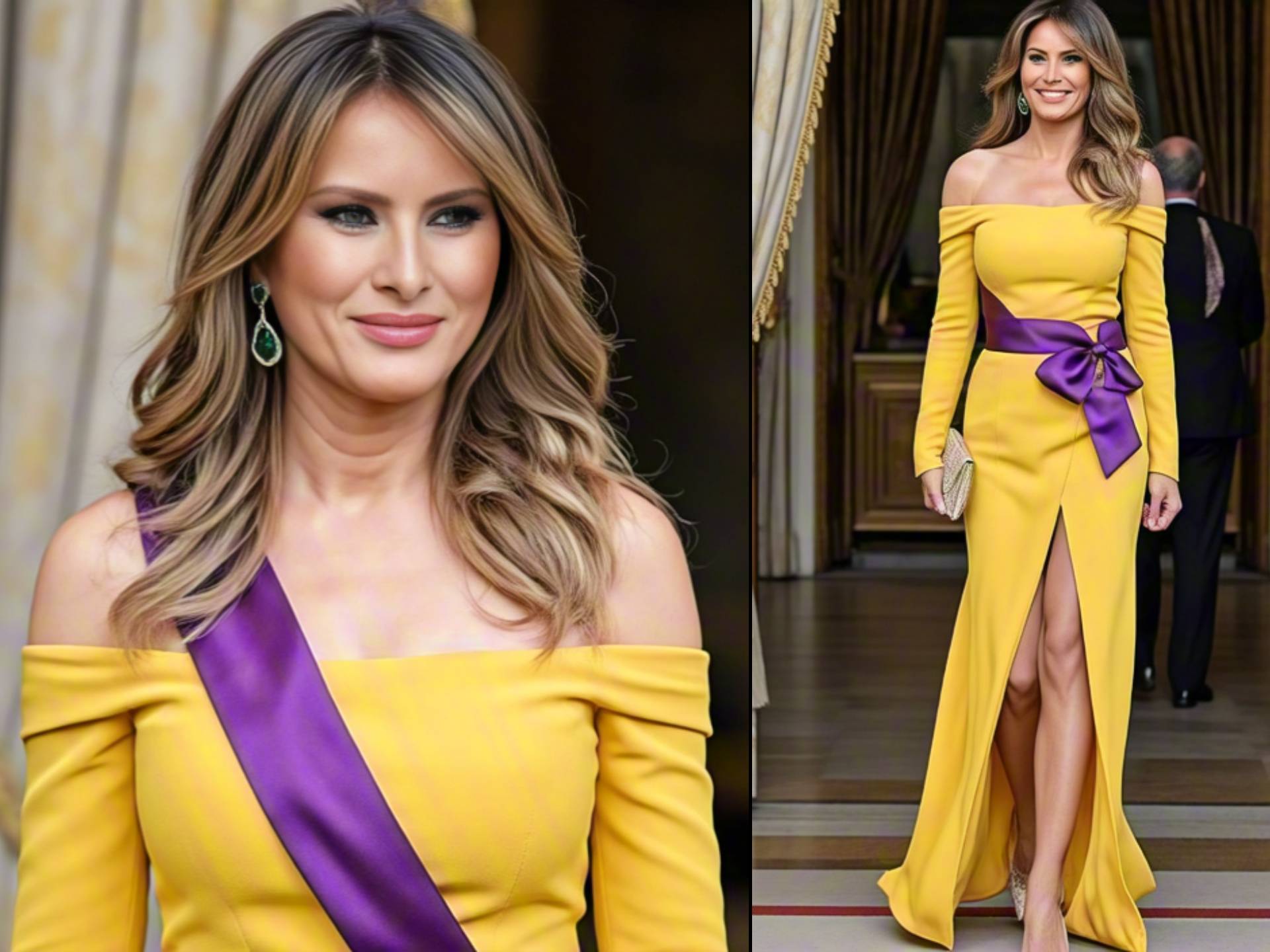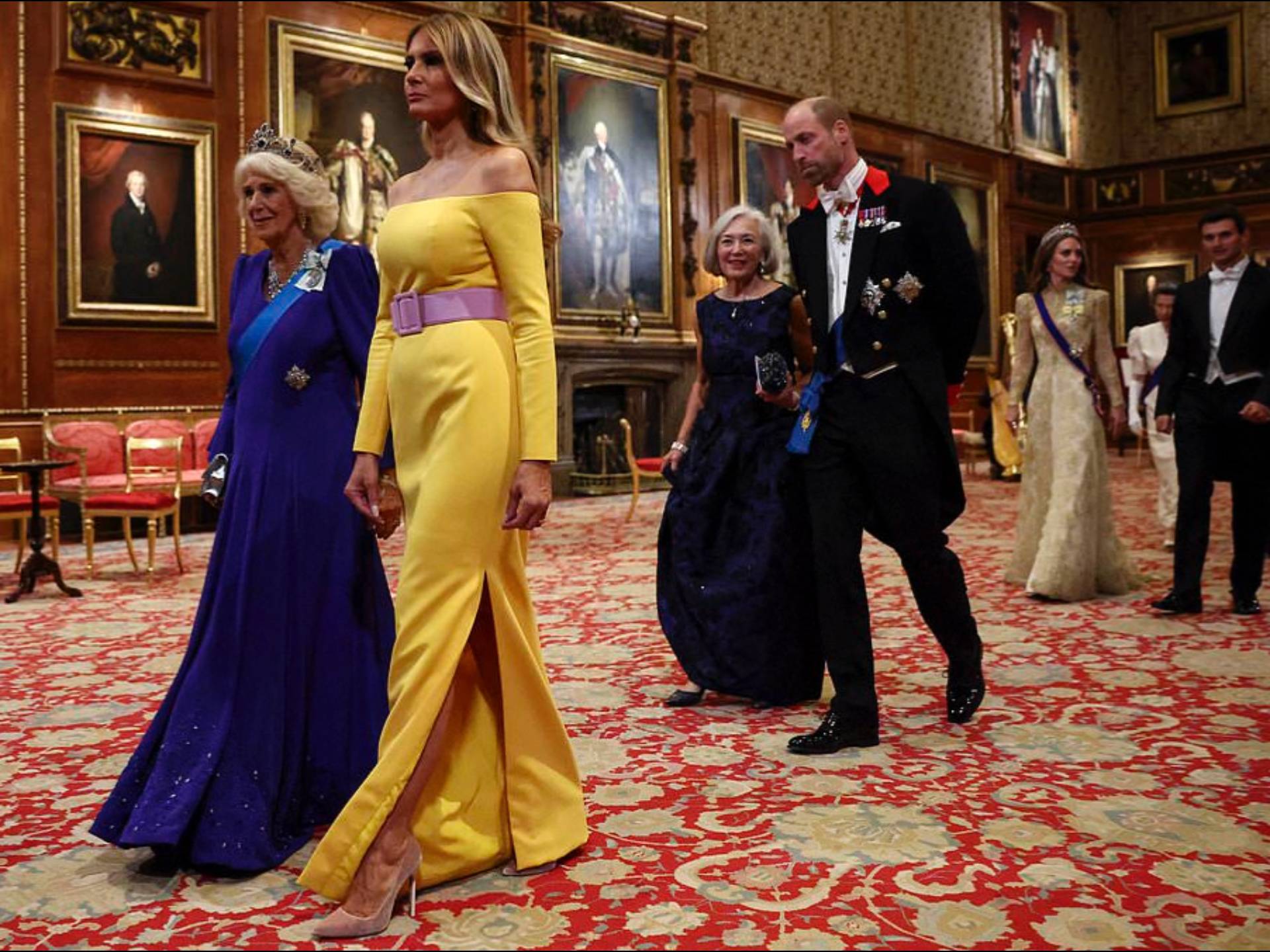 在温莎城堡举办的盛大晚宴上,第一夫人梅拉尼娅·特朗普,身着一袭Carolina Herrera设计的亮黄色连衣裙惊艳亮相。她以一条浅紫色的丝绸腰带轻束腰肢,搭配一对璀璨的绿色钻石耳环,整体造型尽显华贵。