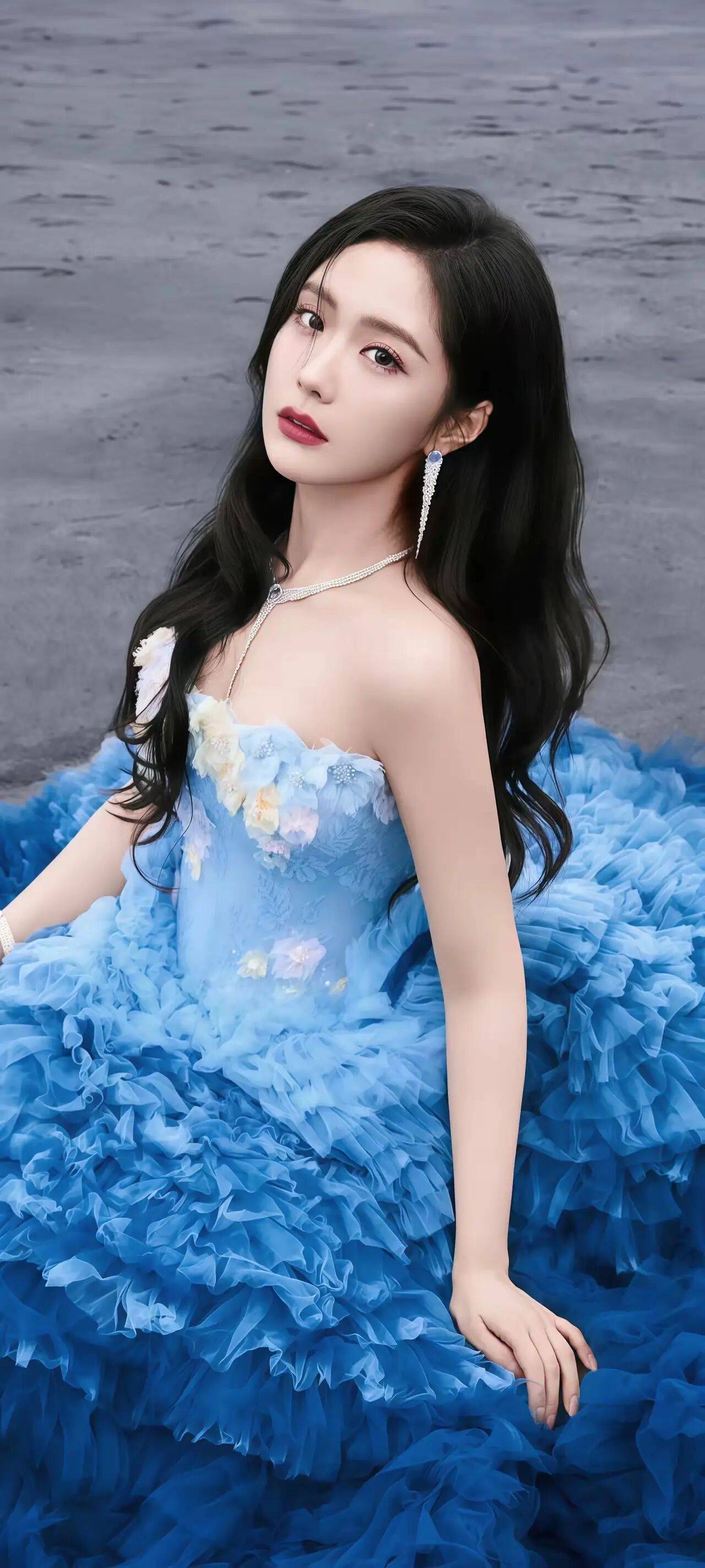 后来,我又看到了她其他风格的造型,才发现她的美真的是多种多样。有一组照片里,她穿着一件蓝色的抹胸蓬蓬裙,裙子上装饰着花朵,就像从童话里走出来的公主。她的长发披肩,微微卷曲,搭配上精致的耳环和项链,整个人优雅又高贵。她坐在那里,眼神温柔又略带一丝俏皮,仿佛在邀请你走进她的童话世界。