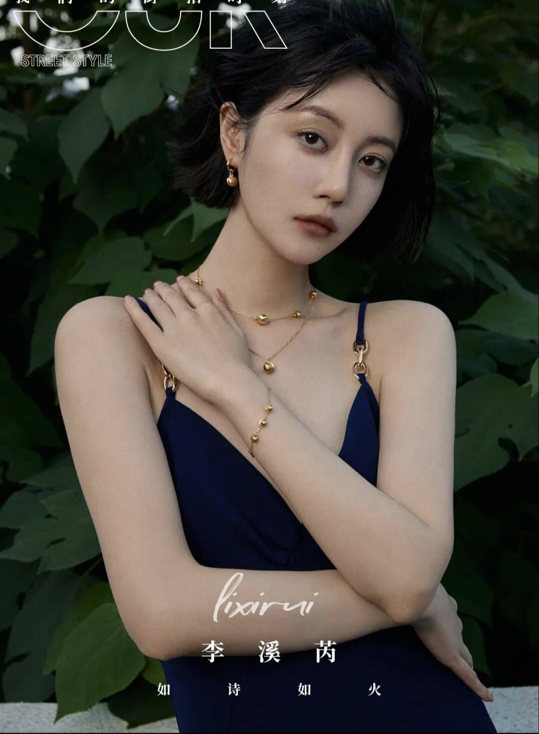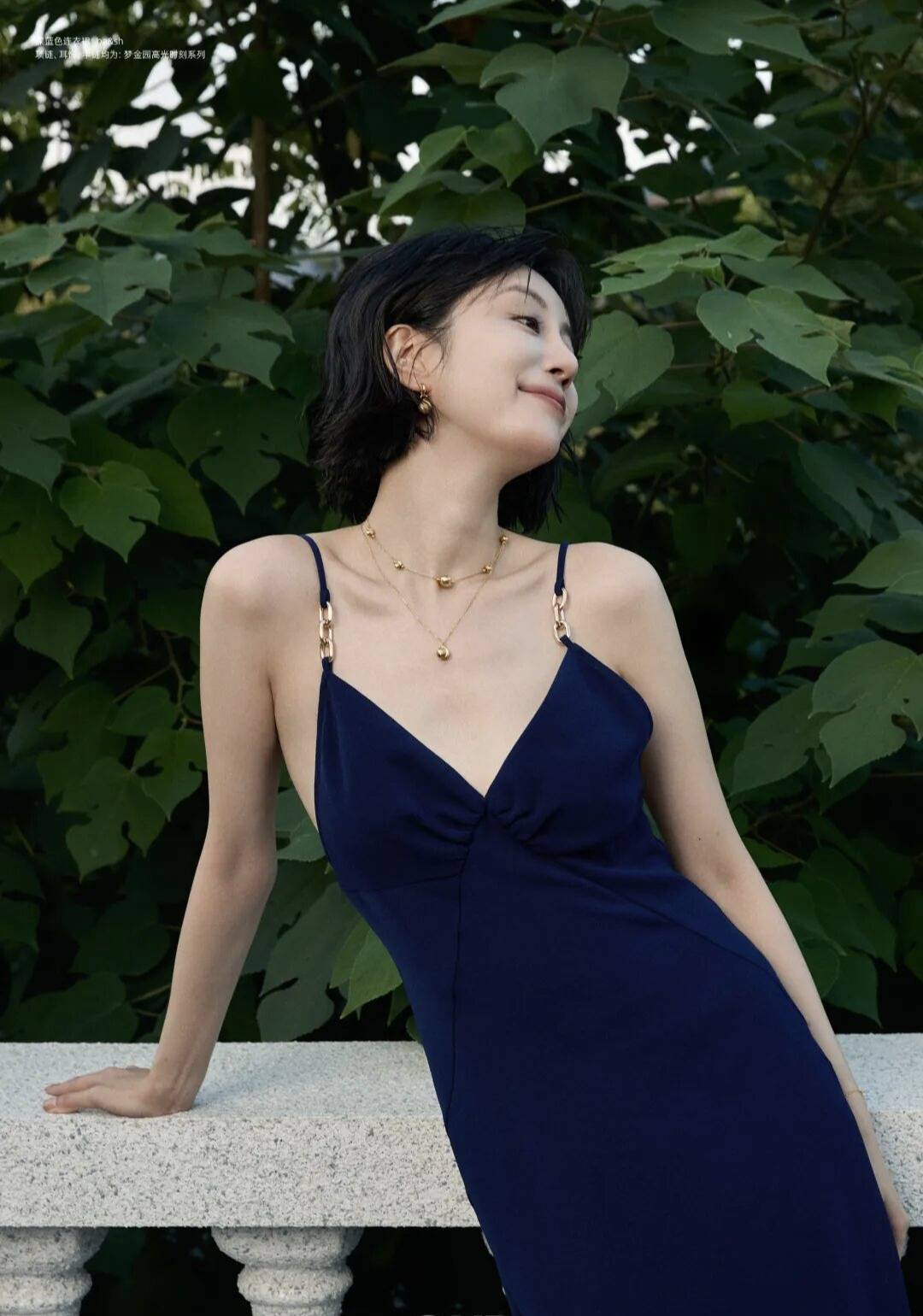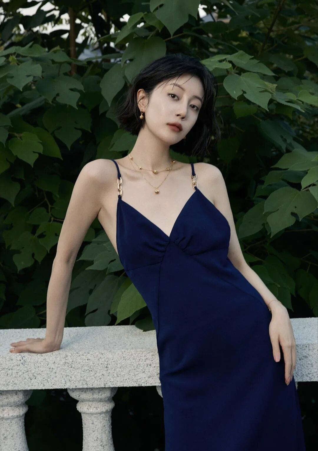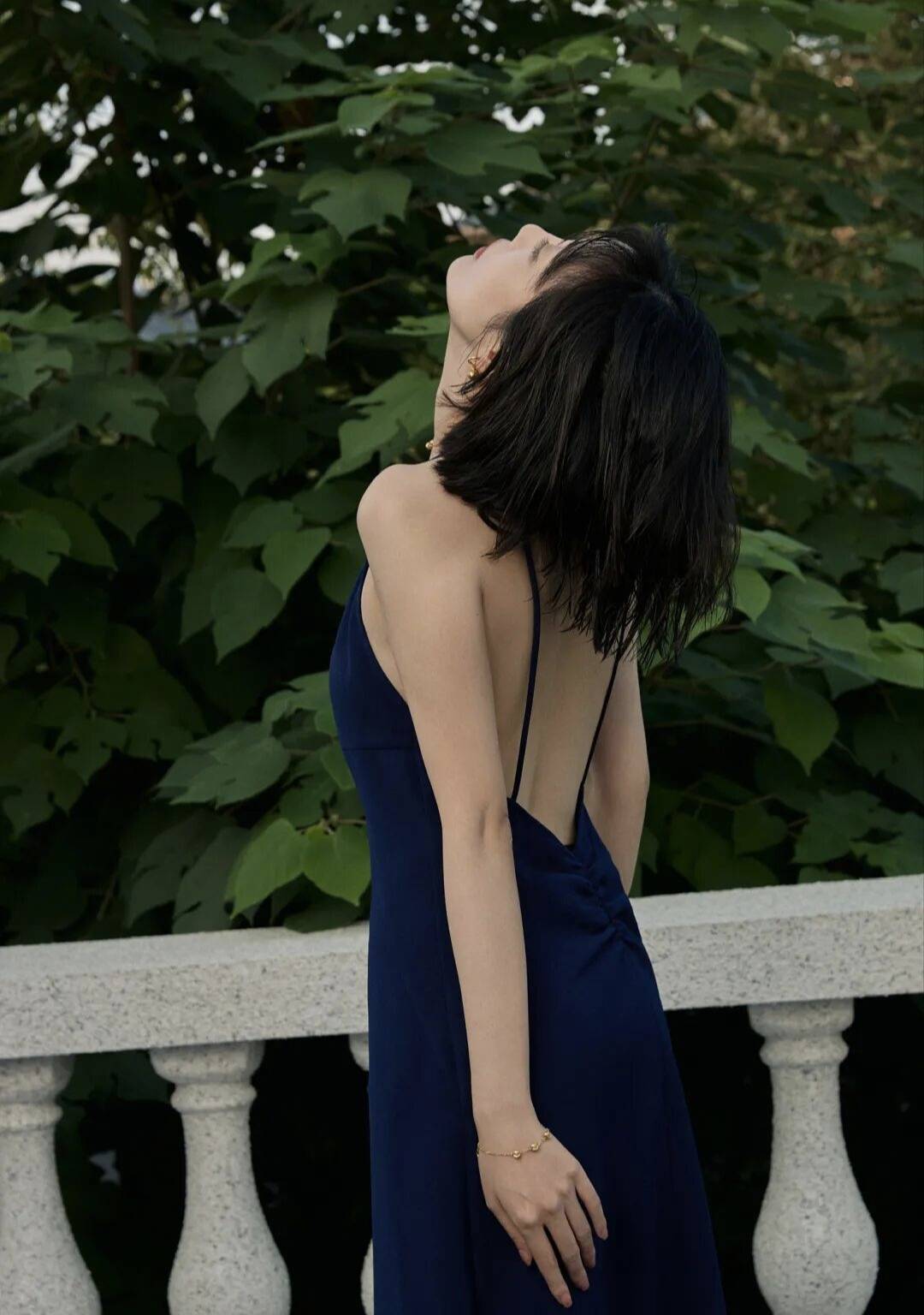背景是一片绿意盎然的植物,和藏蓝色的裙子形成了鲜明的对比,这种色彩碰撞简直太妙了!在绿色植物的映衬下,李溪芮显得更加白皙动人,就像是从画里走出来的仙子一样。她时而站在石栏杆旁,微微低头,露出羞涩又迷人的笑容,仿佛在和这个世界温柔对话;时而侧身而立,眼神灵动俏皮,仿佛藏着无数的小秘密;时而又冷艳地看向镜头,眼神里透露出一种拒人于千里之外的高冷气质,让人不敢轻易靠近,却又忍不住被她吸引。