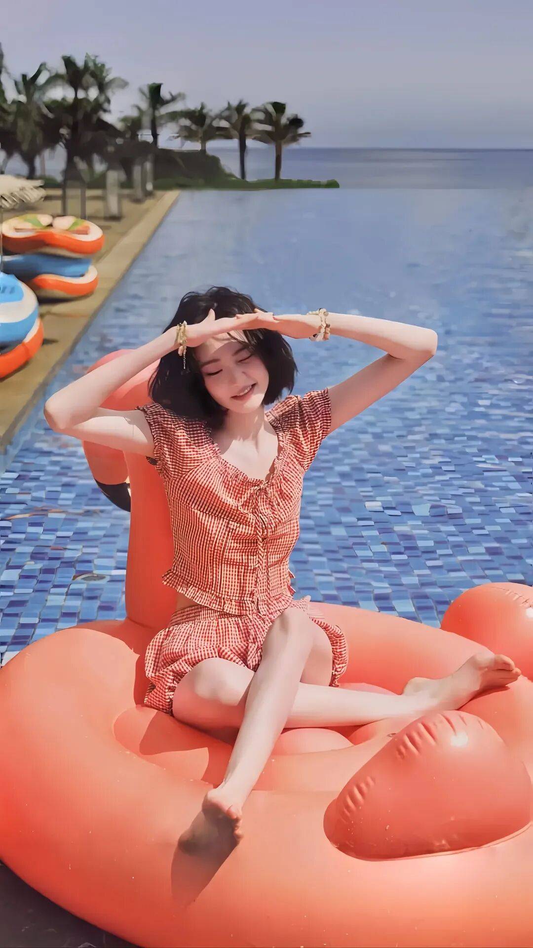 再说说那张她坐在粉色泳圈上的照片,简直是可爱到犯规!她比着耶的手势,脸上挂着灿烂的笑容,元气值直接爆表。我仿佛都能听到她那欢快的笑声,感觉她就像一个快乐的小天使,把快乐传递给每一个人。