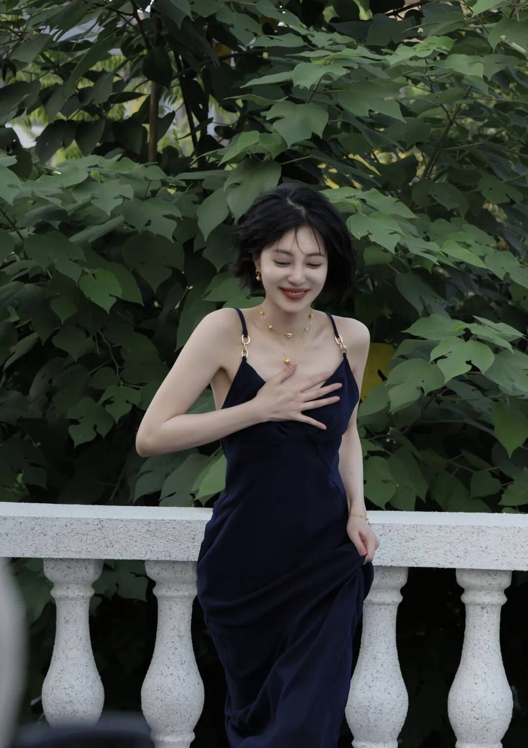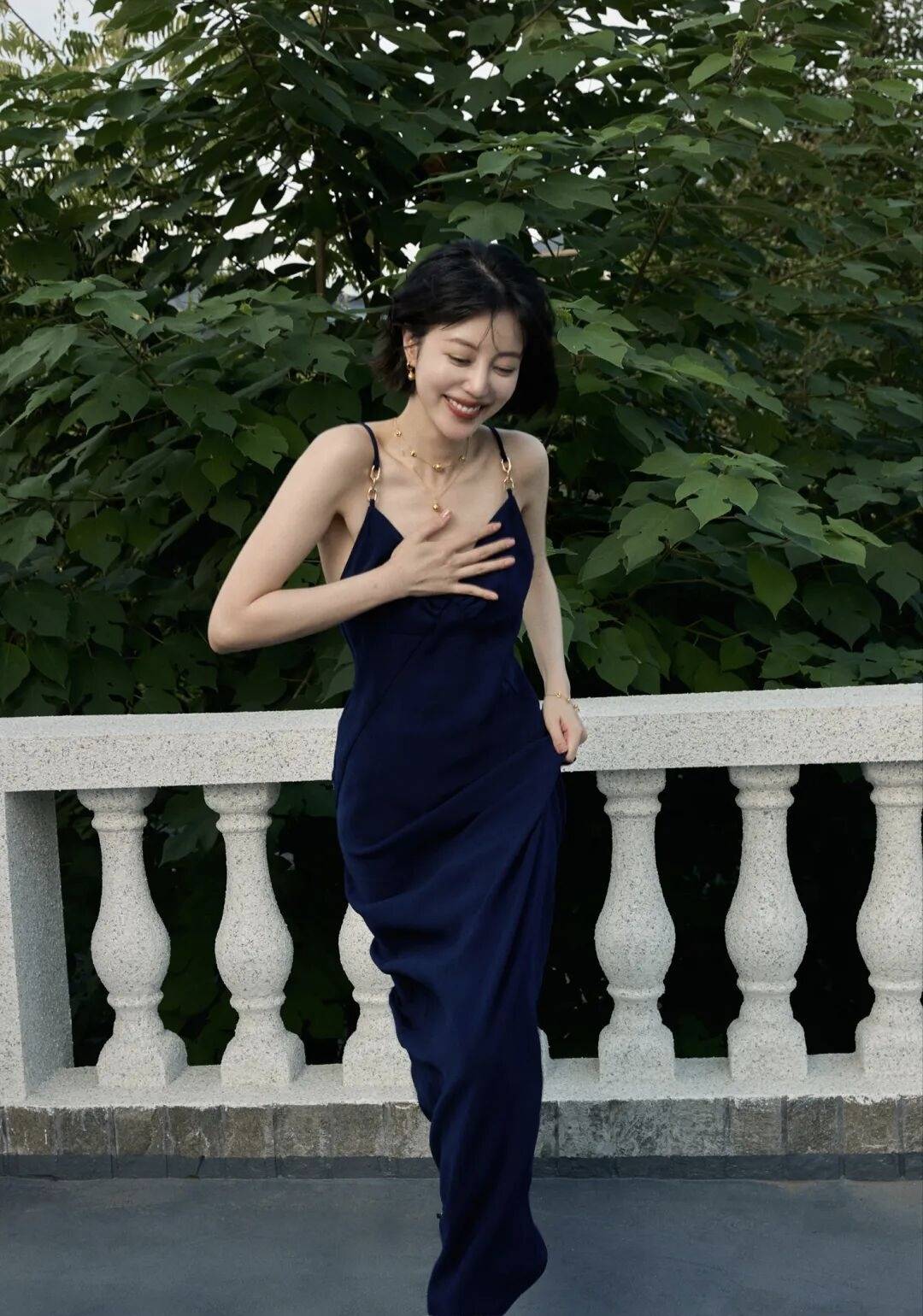 她穿的那条藏蓝色吊带长裙,简直太有韵味了!深V领口设计,恰到好处地露出她精致的锁骨和优美的颈部线条,性感得不要不要的。裙子的剪裁超级合身,完美地勾勒出她曼妙的身姿,该凸的凸,该凹的凹,这身材比例,简直是老天爷赏饭吃!吊带上的金色扣环和裙子腰间的褶皱设计,又给整体造型增添了几分精致感和设计感,让这条裙子不再单调,反而充满了法式风情的浪漫与优雅。