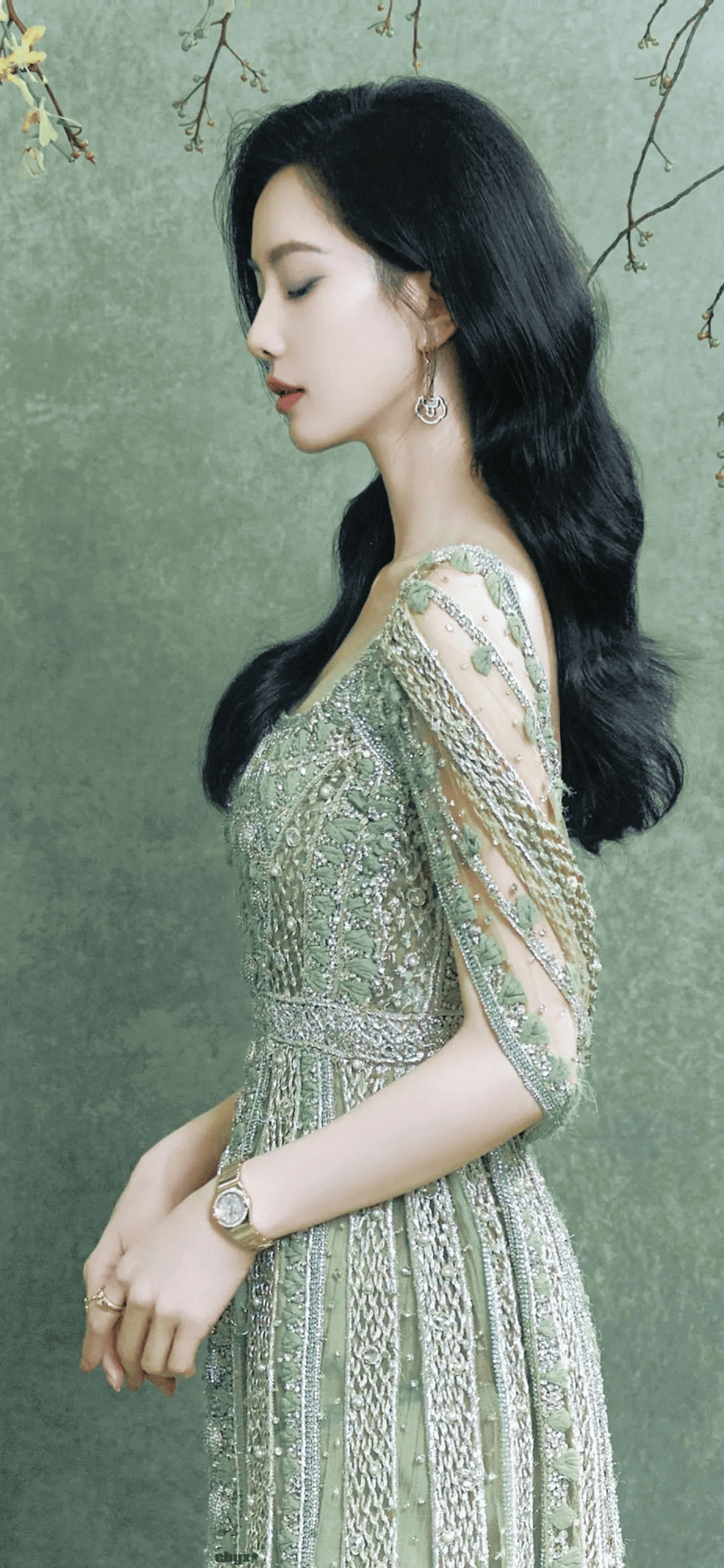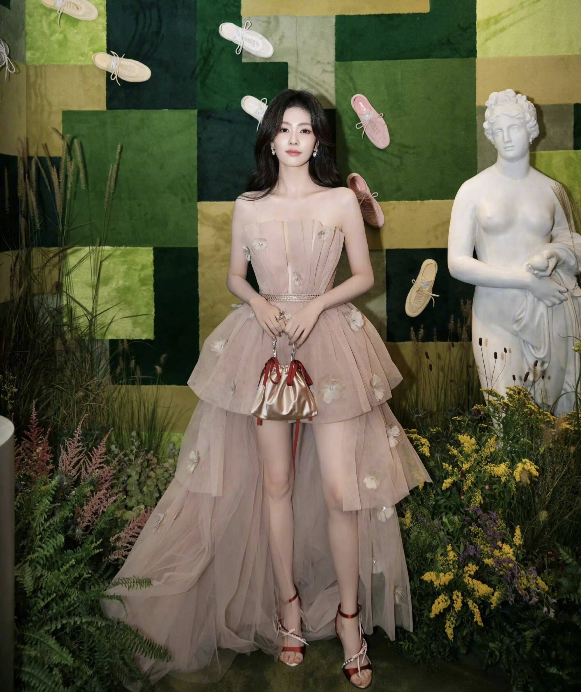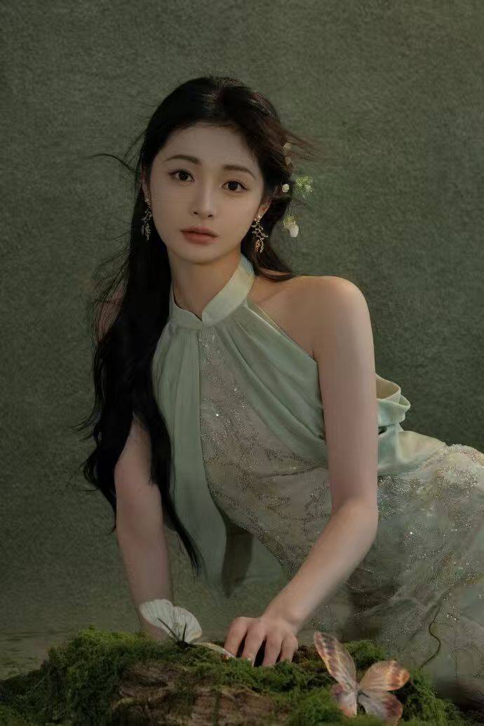 先说说她这次的造型,整体就像把春天穿在了身上。那一袭绿色的连衣裙,简直是神来之笔。这绿色不是那种扎眼的荧光绿,而是带着一种柔和又清新的色调,就像是清晨第一缕阳光洒在刚冒头的嫩叶上,透着满满的生机与活力。裙子的材质轻盈飘逸,走起路来,裙摆就像灵动的翅膀,随着她的步伐轻轻摇曳,仿佛下一秒她就要飞起来,化身成真正的绿精灵在林间穿梭。