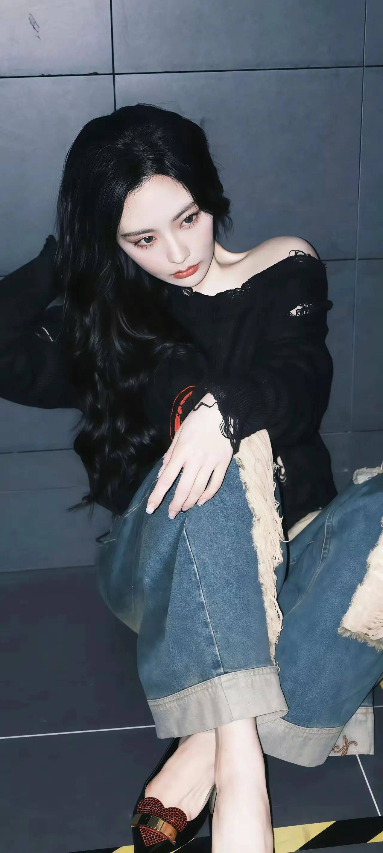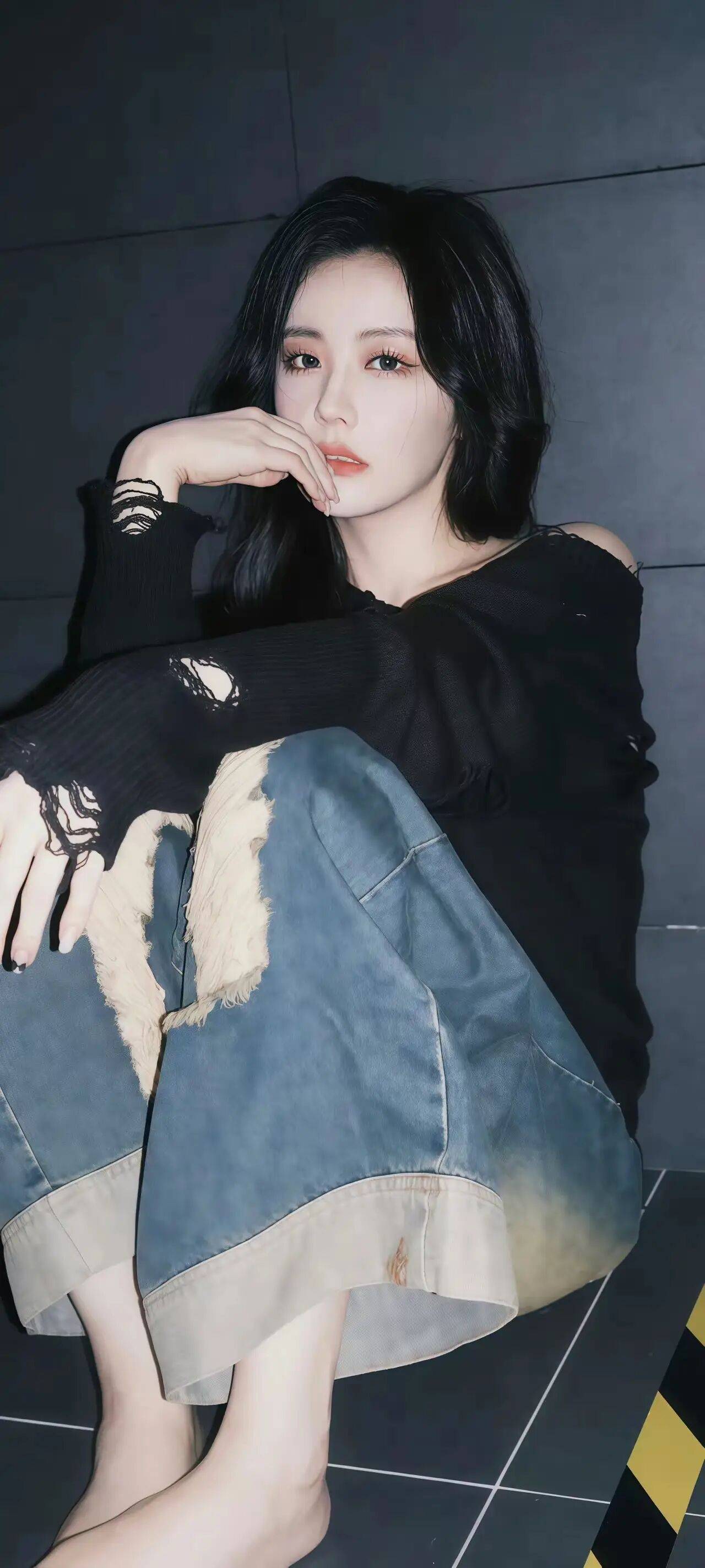 而她坐在灰色瓷砖地上的那组照片,又给人一种慵懒又随性的感觉。她穿着破洞的黑色毛衣和宽松的牛仔裤,光着脚丫,一只手托着脸,眼神略带一丝忧郁。这种自然又真实的状态,让她看起来更加亲切,就像我们身边的朋友一样。