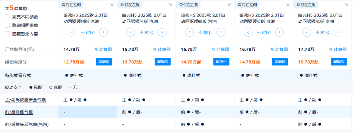 配置方面,12万多的最低配哈弗H5只有2个主副驾驶安全气囊,也没有配备像主动刹车和车道偏移预警等主动安全配置,这点大家要知晓。不过,即使是最低配,车主也可花3000元选装后桥差速器,这点对于经常跑工地和非铺装路面的人来说还是挺有帮助的。