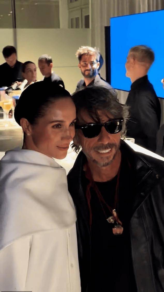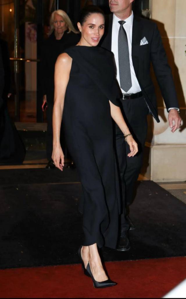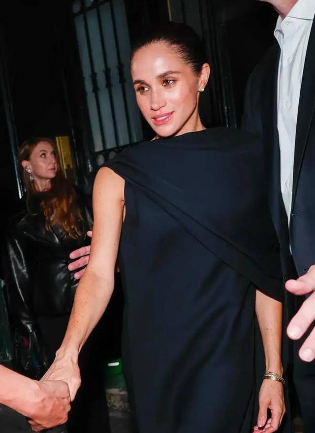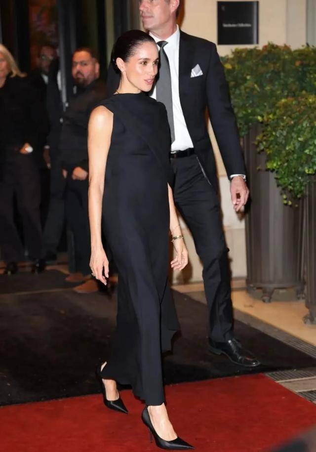 话说回来,梅根的时尚感和衣品还是不错的。这次来看秀,换了两套造型,出席晚宴时,一身无袖黑色礼服,梳着高马尾,很优雅高级,妥妥的老钱范儿。