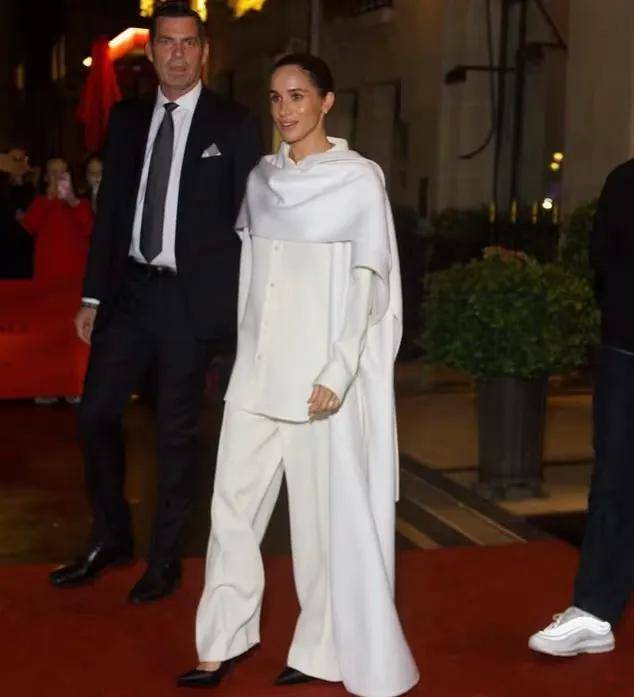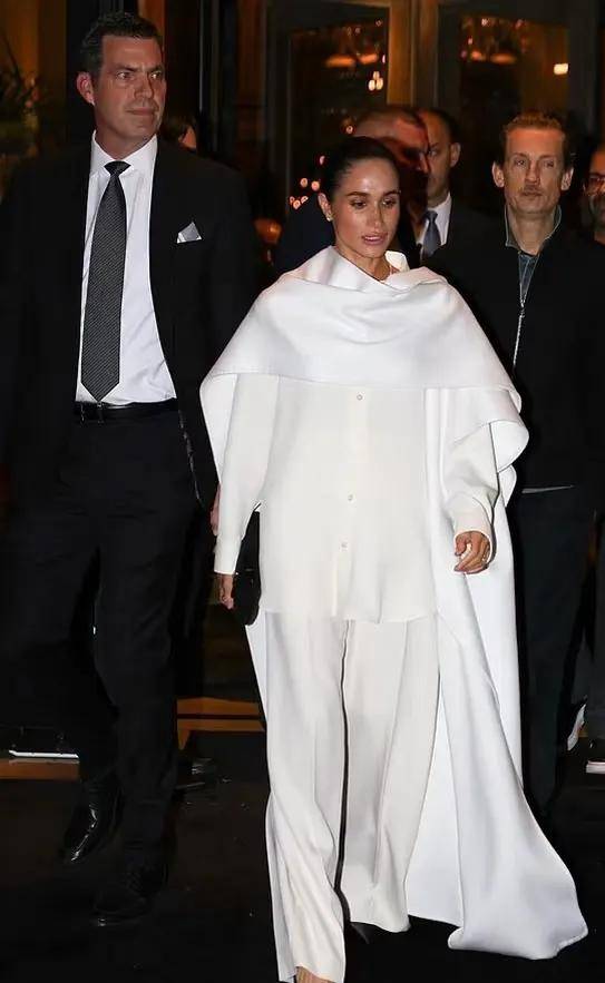 当天把头发梳成光滑发髻的梅根,选择了大面积的白色来装点自己,整体感觉颇为宽松,并且还用了一条略显夸张的围巾来点缀自己,不过也就是这条围巾,让梅根成为了社交媒体上嘲讽的对象。