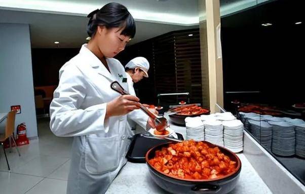 在这些食堂里,偶尔也会有一些肉类,虽然分量不多,但对于工人们来说,这也已经是非常珍贵的食物了。很多人会将煮过的猪肉或煎好的豆饼夹在米饭里,再用泡菜卷着吃,这种简单的组合,却能让他们吃得津津有味。