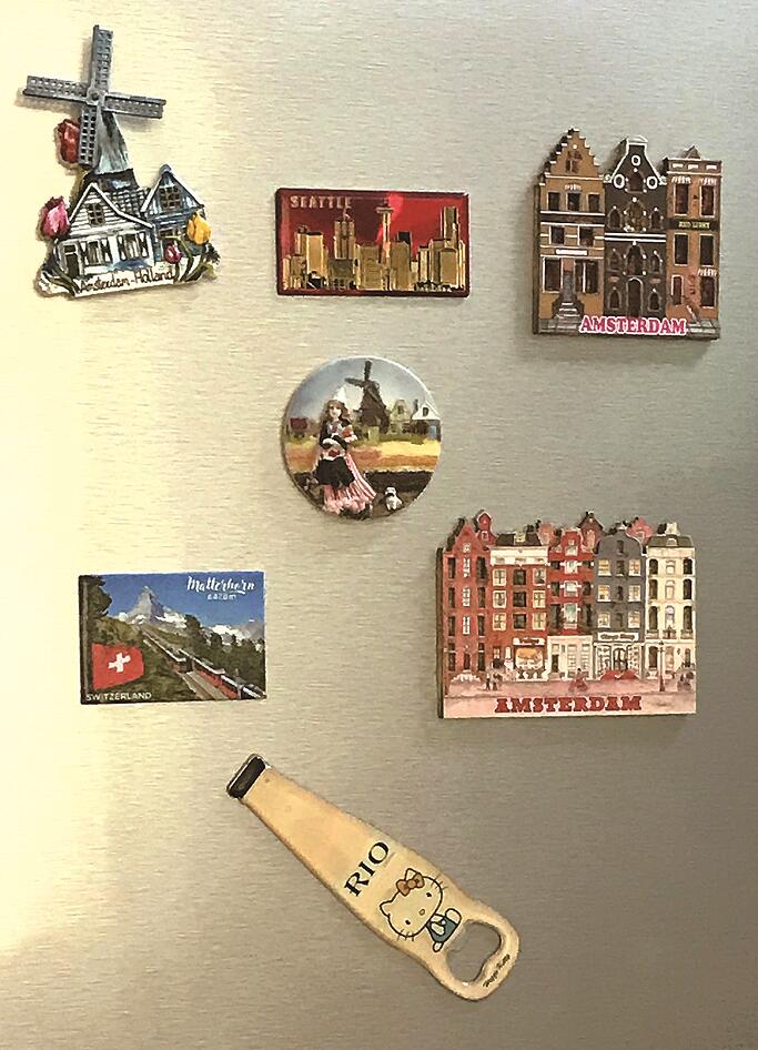 因为喜爱旅游,我到过40多个国家和地区,由此积累了600多件舶来品,它们带给我不一般的温馨回味。 我家客厅醒目的位置摆放着一组象群,它们是我从泰国清迈带回来的。大象是泰国文化的核心元素,是力量和优雅、聪慧而富有灵性的象征。木雕是泰国清迈的一大特色 ,当地的邦他哇村(Baantawai)是著名的木制品制造中心。 我在当地的集贸市场内看中了一头木雕大象,作品雕刻得很精细,背部的坐垫和头部的额头上点缀着70多颗五颜六色闪光的小芯片,栩栩如生。大象乃柚木材质,高20厘米,长23厘米。摊主开价50元人民币一个,我最后“杀价”为20元人民币一个。 在临成交前,我随口问道:“你能不能再送一个呢 ?”没有想到他竟然回答:“可以”。然后笃悠悠地从摊位下取出一个高 6厘米,长8厘米的小象,我差点笑岔了气。 结果,我购买了两个大象木雕制品,奉送了两头幼象。我把这群象放在客厅的醒目位置 ,幼象紧紧地跟随着父母在踱步 ,看到它们,我仿佛又看到了当时买卖的情形,忍俊不禁。 书房的窗台上有一个透明玻璃瓶,阳光洒下,瓶中的点点金砂熠熠生辉。这可是我亲手淘的金呢! 新西兰南岛的仙蒂镇位于西海岸格雷茅茨以南约10公里处,因1860年的西海岸淘金热而兴起。亲身体验淘金是仙蒂镇的一项旅游活动。 在一个大棚下的水槽前,游客每人分得一个铜盆。我们首先从水槽内舀出一些沙石和水 ,在当地淘金师傅的指导下 ,用流水不断冲掉盆中的沙石。手法非常重要,稍不留神砂金就会连同石头一块被淘出去了。许多游客折腾了半天,盆里还是一大堆小石头,没有半点金子的影子。最后,还得求助这里的师傅来操作。只见他接过铜盆,大刀阔斧地淘洗了几下,盆底细小的金砂就显露了出来。 师傅会将这些砂金粒装进小瓶内,送给游客留作纪念 。砂金是不另外收费的,它们都包含在旅游门票内了。我将自己亲手淘得的十多粒砂金保存至今 。 另外,我还收藏有10多个国家的20多个冰箱贴,其中有法国巴黎的埃菲尔铁塔 、卢浮宫,有德国柏林的勃莱登堡门,有瑞士的铁力士雪山 、马特洪峰雪山,有希腊的扎金索斯岛,有荷兰的郁金香、风车、美女和阿姆斯特丹古老城市建筑……这都是一次次旅游的收获。每天在厨房间看到冰箱上的这些各国风光,就仿佛故地重游。 期待着疫情过去,期待着世界重新打开。