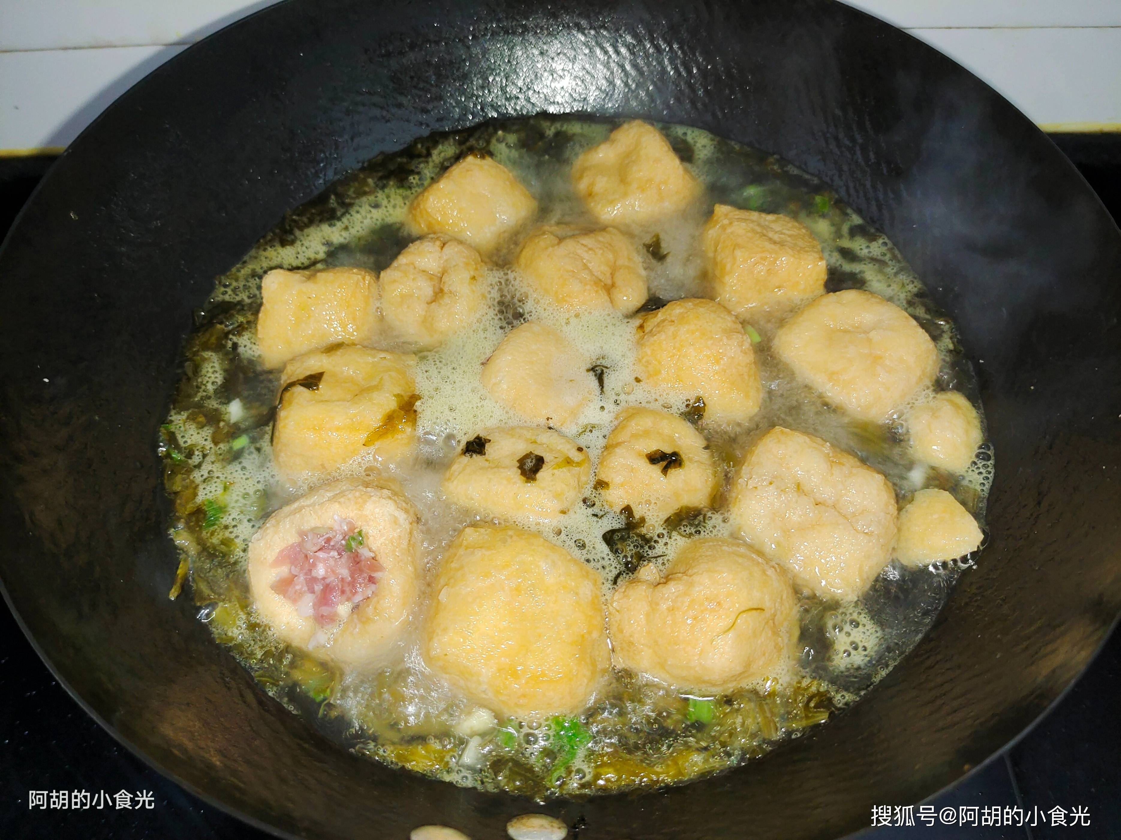 2. 煮制过程中用勺子轻轻按压油豆腐,帮助去除部分油脂。
