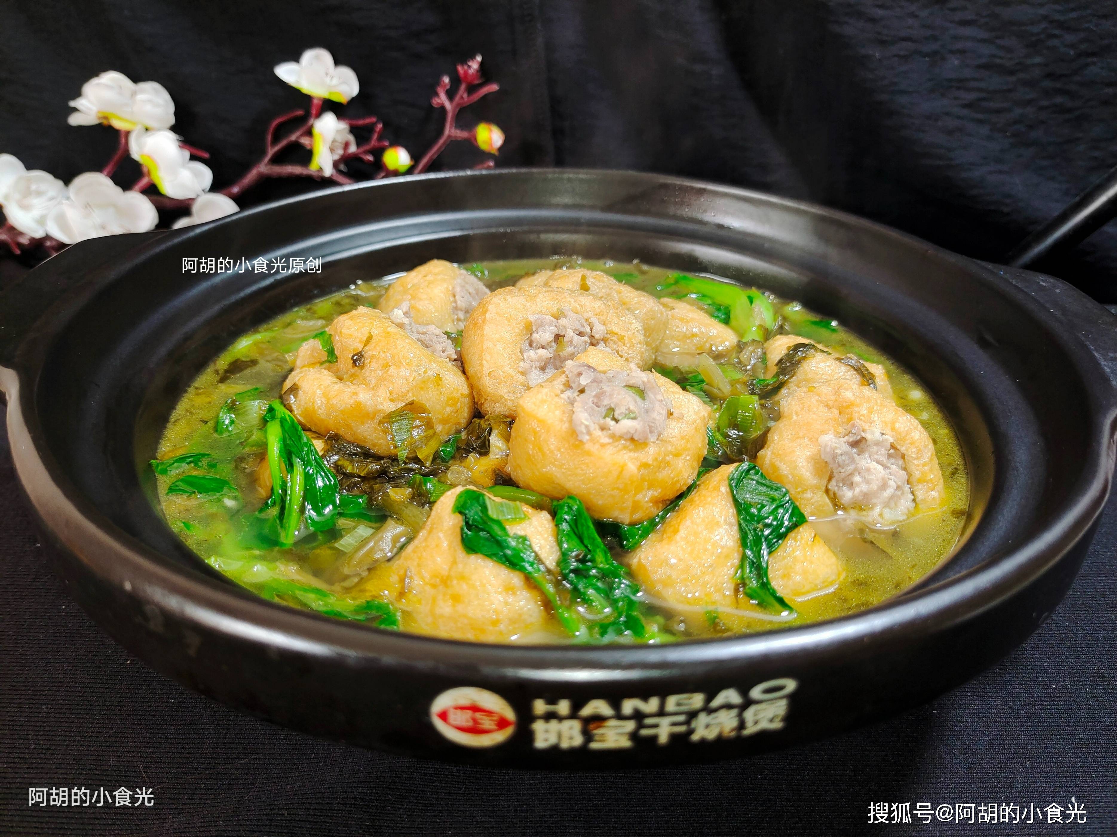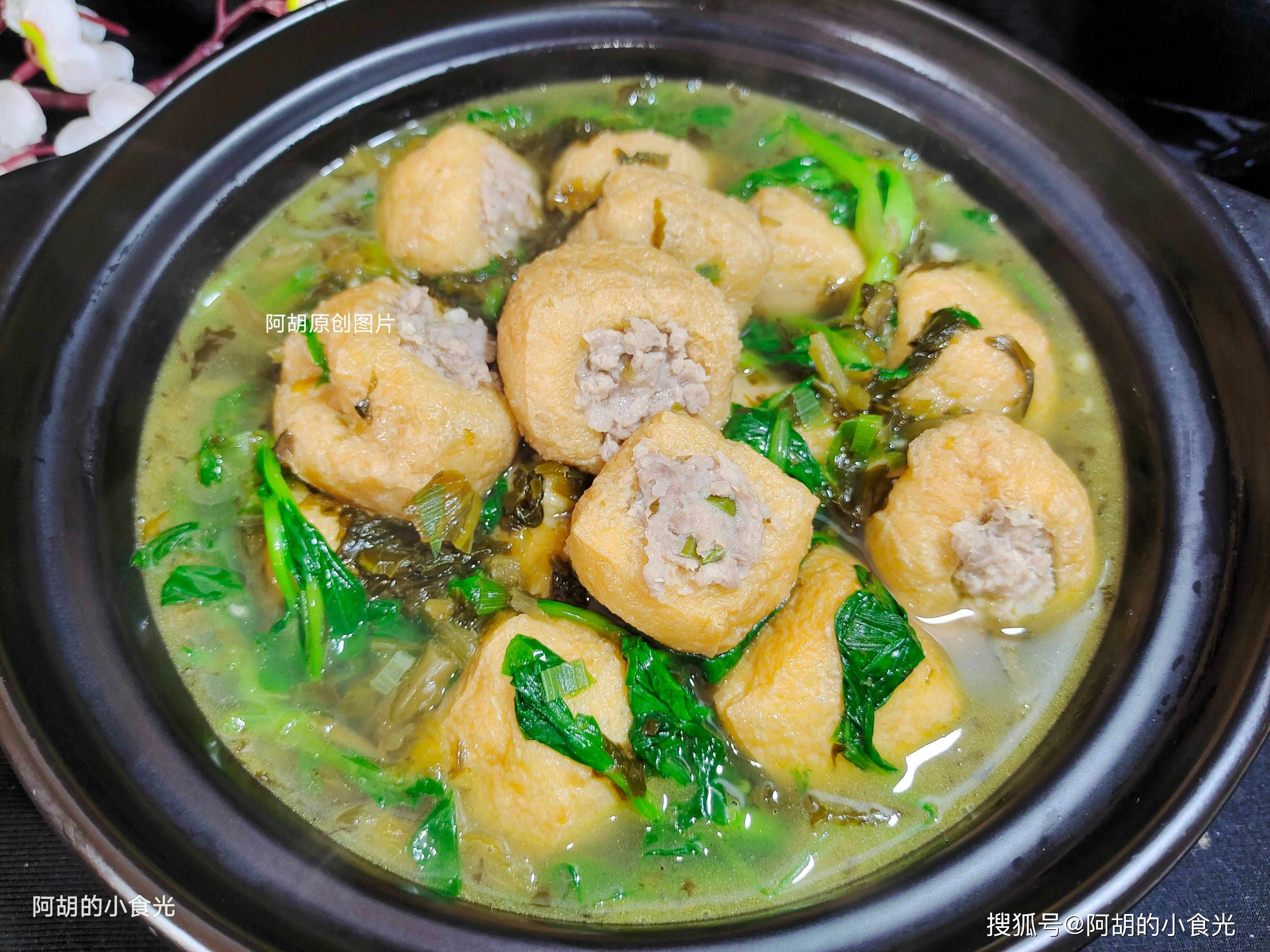 - 口感丰富:外层油豆腐吸饱汤汁后软嫩多汁,内里肉馅鲜嫩弹牙,雪菜的咸香与青菜的清爽相互映衬。