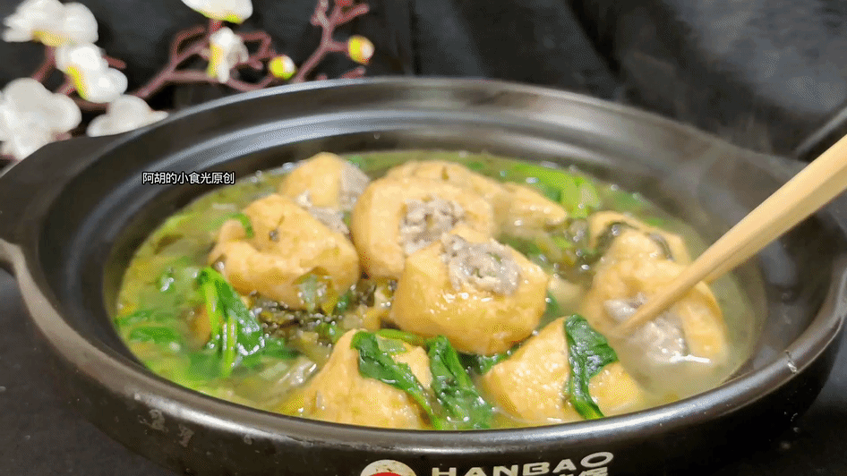 在天气转凉之际,一道热乎乎的汤菜总能带来满满的幸福感。“雪菜油豆腐塞肉”便是这样一道集鲜、香、嫩于一体的暖心佳肴。它以油豆腐为载体,内填鲜嫩肉馅,搭配咸香的雪菜和翠绿的小青菜炖煮而成。油豆腐吸饱汤汁后,咬一口满嘴爆汁,肉香与雪菜的咸香完美融合,是秋冬季节餐桌上的绝佳选择。