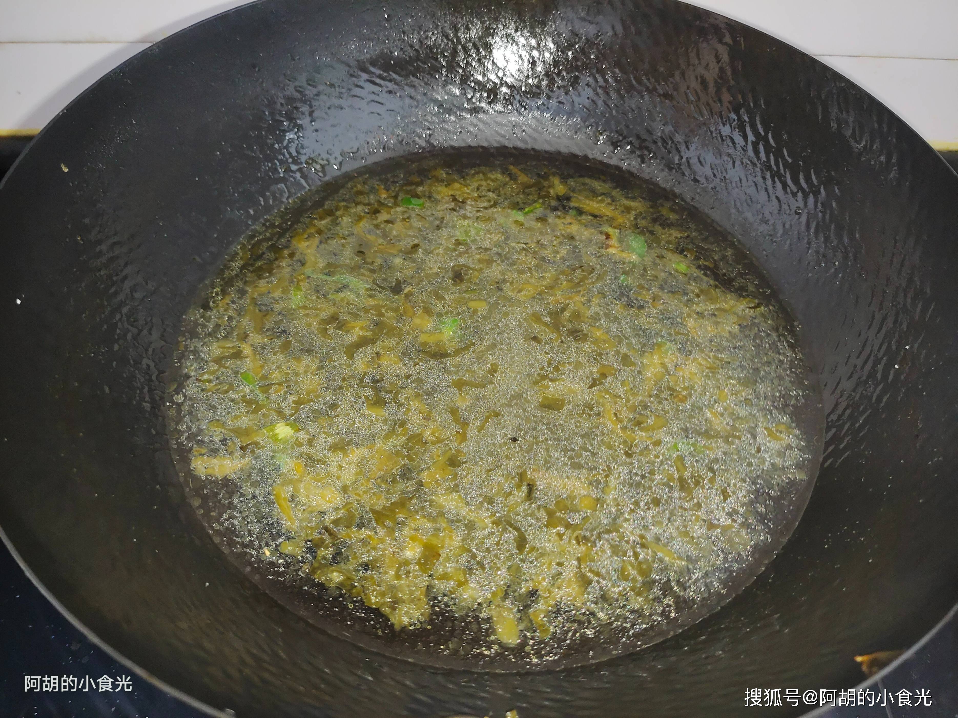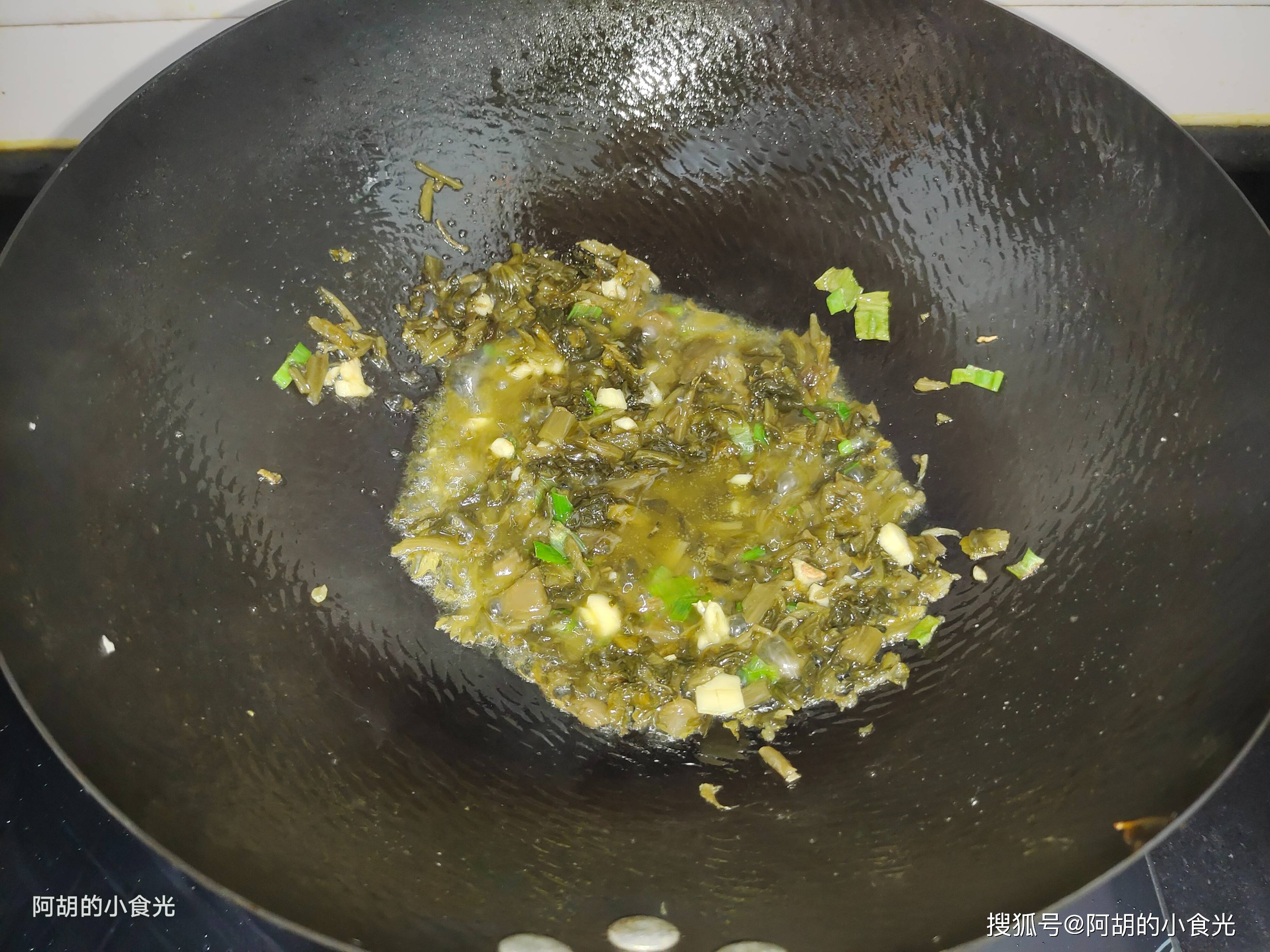 2. 放入雪菜碎,中小火翻炒至雪菜香味四溢,微微发干(这一步能激发雪菜的风味)。
