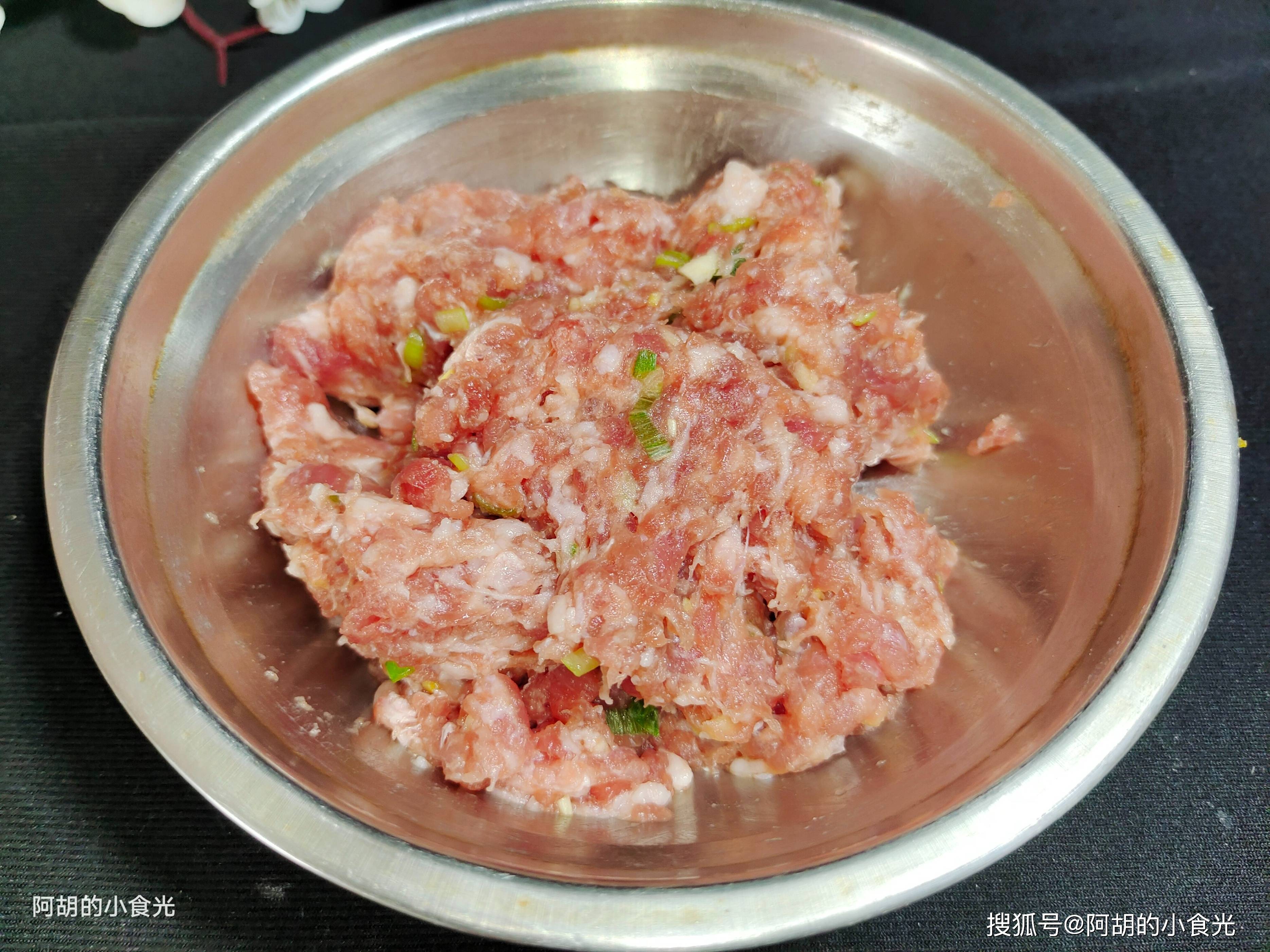 1. 猪肉末中加入葱姜末搅拌均匀。